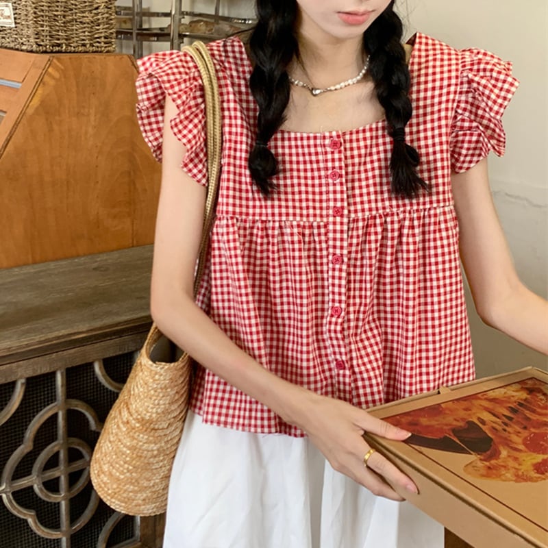 ショート丈 チェック柄 フレンチパフスリーブ へそ出しフワフワ袖シャツ レディース 新作 夏物 シフォン半袖