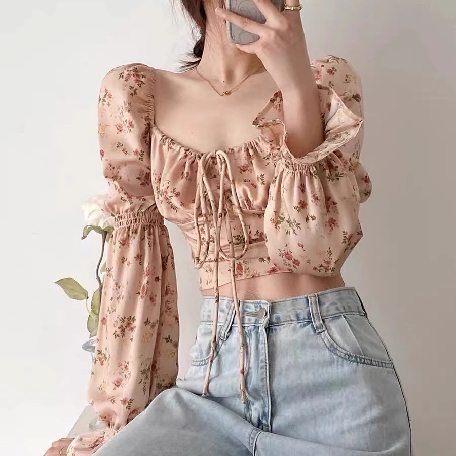 フレンチスタイル トップス ショート丈 長袖 スクエアネック パフスリーブ へそ出し プリントシャツ