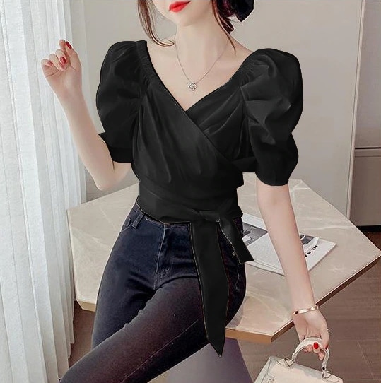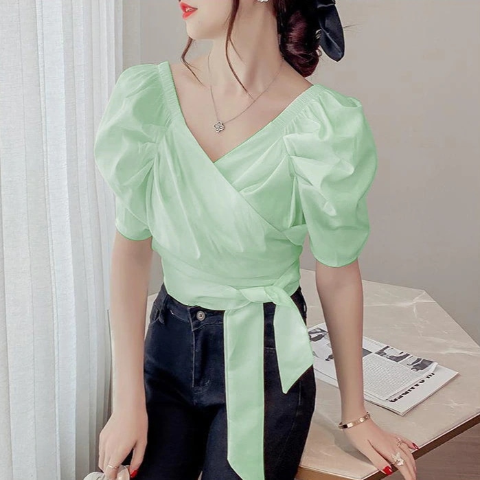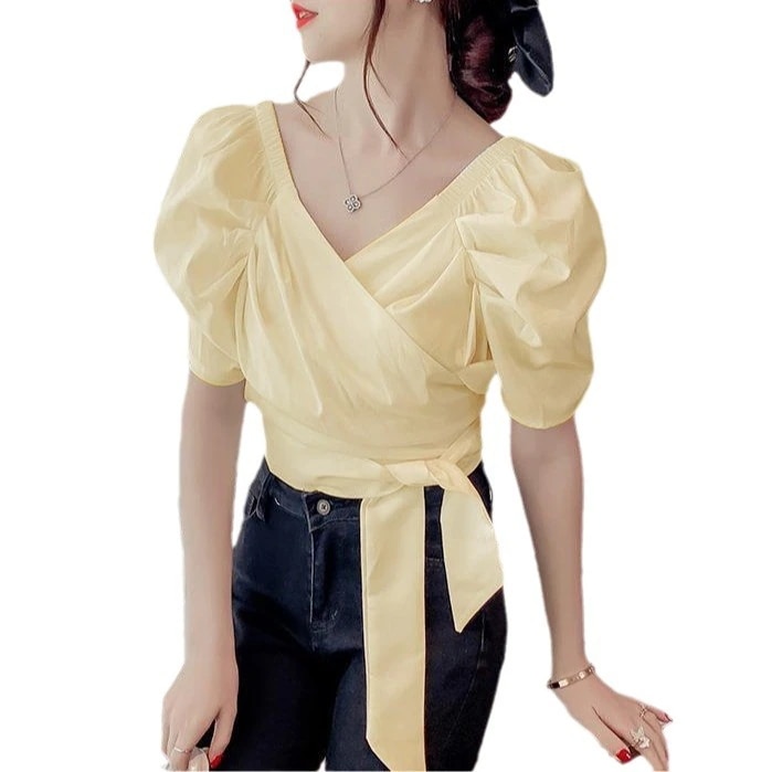 春夏新作 フレンチ風パフスリーブ リボン付き レディース 半袖 ショート丈トップス Tシャツ風シャツ