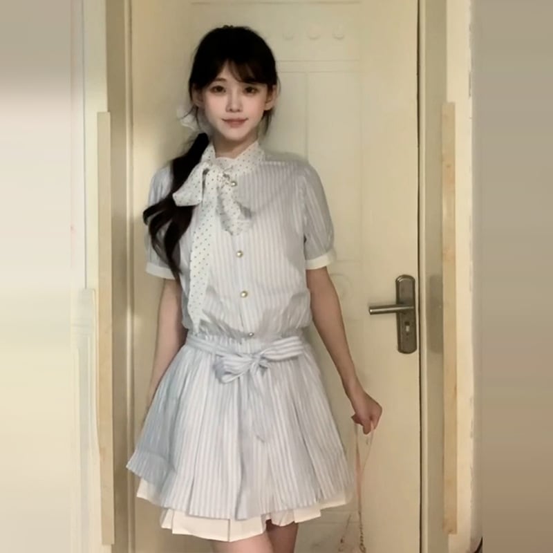 ストライプ&パッチワークリボン柄シャツワンピースセット レディース 夏の新作 半袖 ウエストマーク スリムシルエット ミニスカート