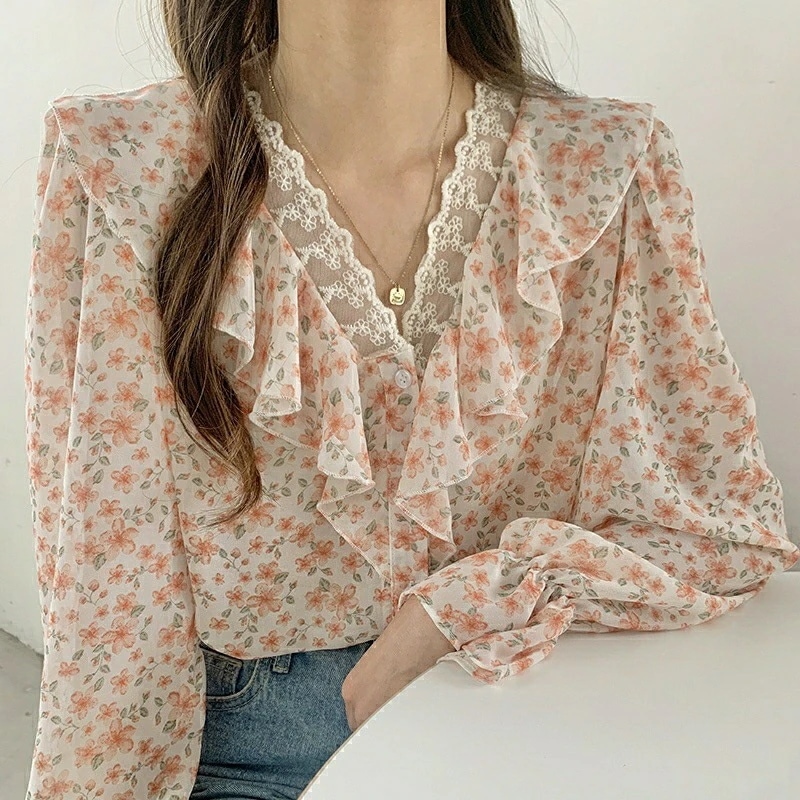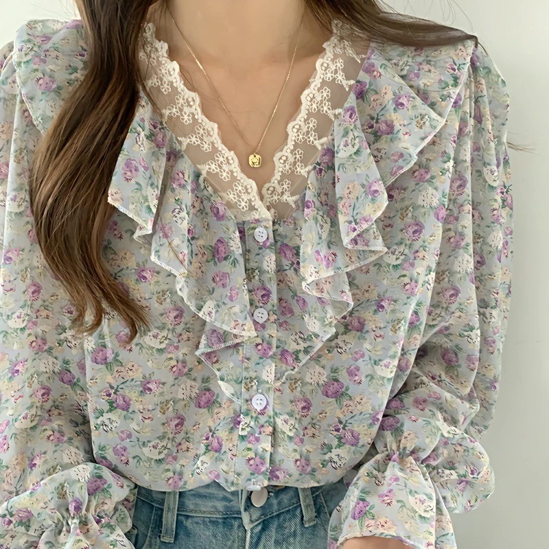 春夏新作 フリルとレースをあしらったシフォンブラウス キュートな小花柄 ゆったりシルエット