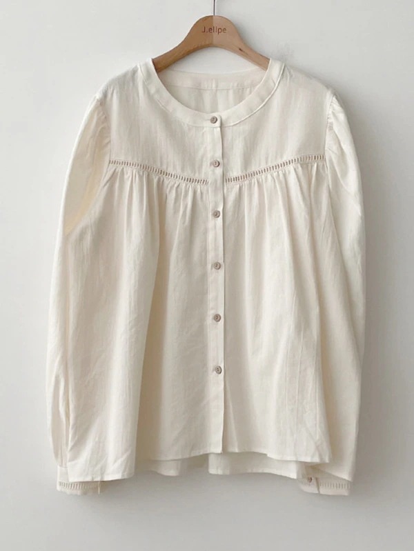 韓国2026年新作レディースウェア パッチワーク 透かし編み レース ブラウス キュート 春秋用無地
