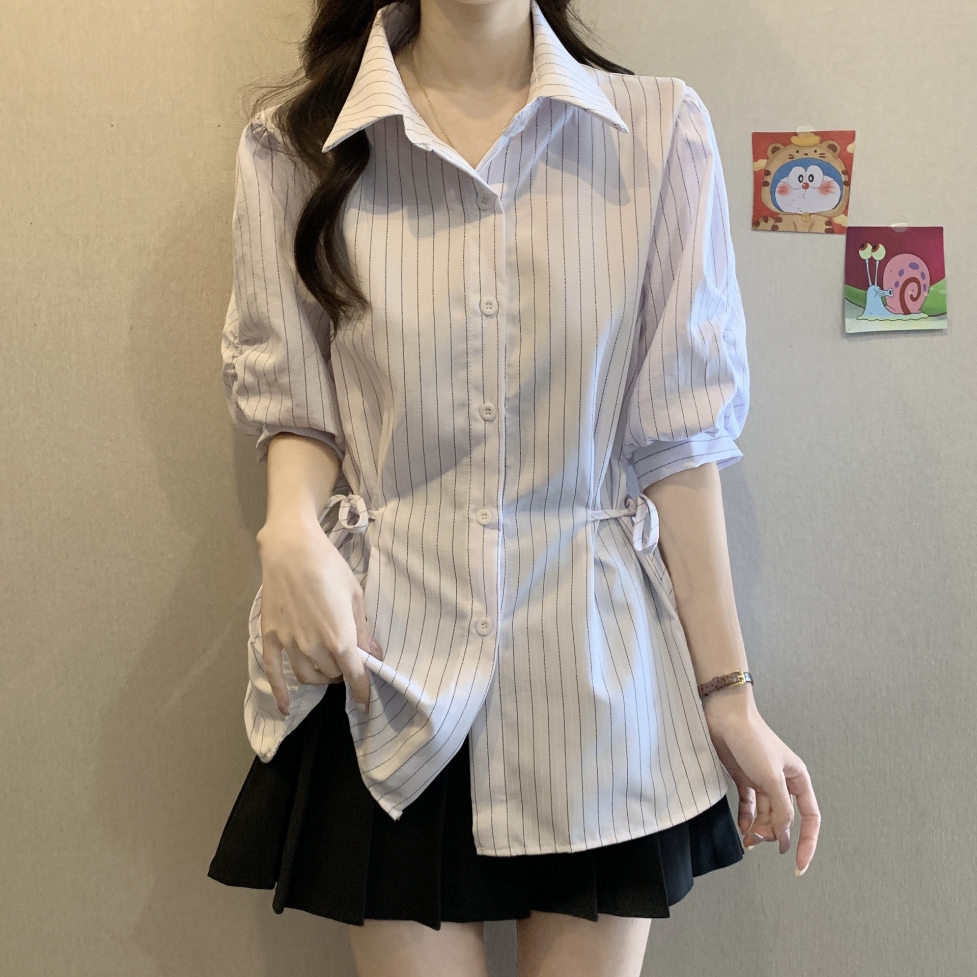 ブルーのストライプ柄レディースシャツ フレンチスタイルの半袖 上品なシャツ 夏用 Lサイズ 2026年新作 スリム効果あり どんなスタイルにも合うトップス
