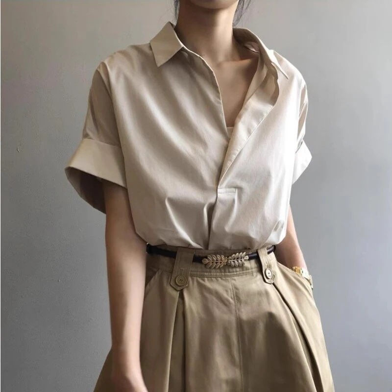 夏の新作 半袖シャツ レディース ニッチ 香港風 レトロ ゆったりVネック シャツ 個性的な韓国風トップス