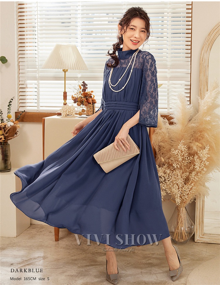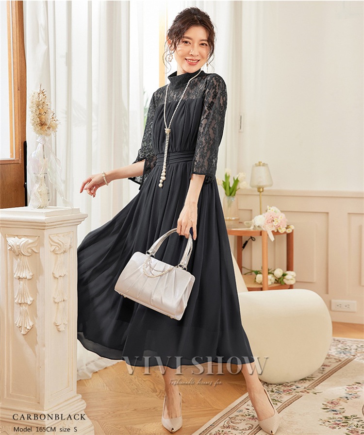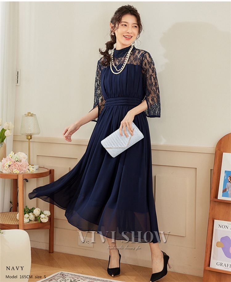 「最安値販売」ドレス レース切替え 5分袖 プリーツ ロング丈 結婚式 ワンピース パーティードレス レディース