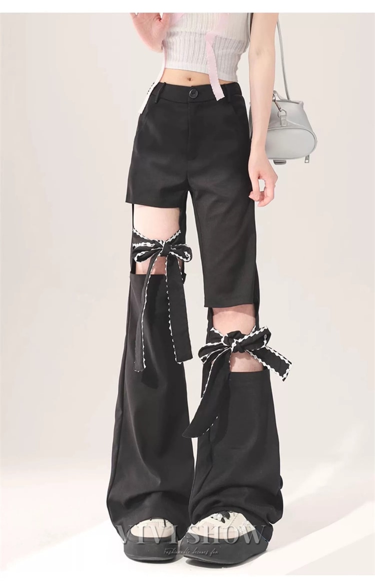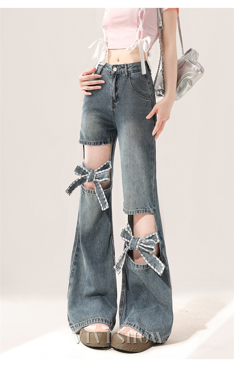 「最安値販売」レディース パンツ デニム ジーンズ リボン ワイド デニムフレア パンツ