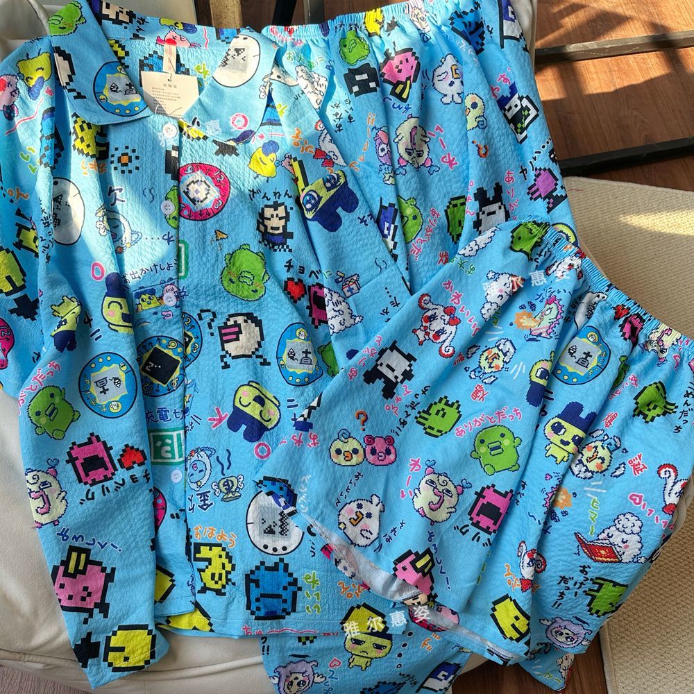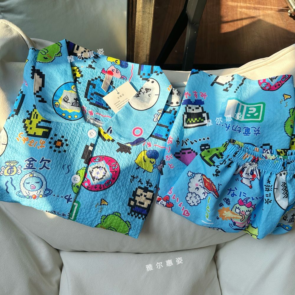 女性用夏物パジャマ少女向けのかわいい漫画柄クレープ生地半袖カーディガンと長ズボンのホームウェアセット