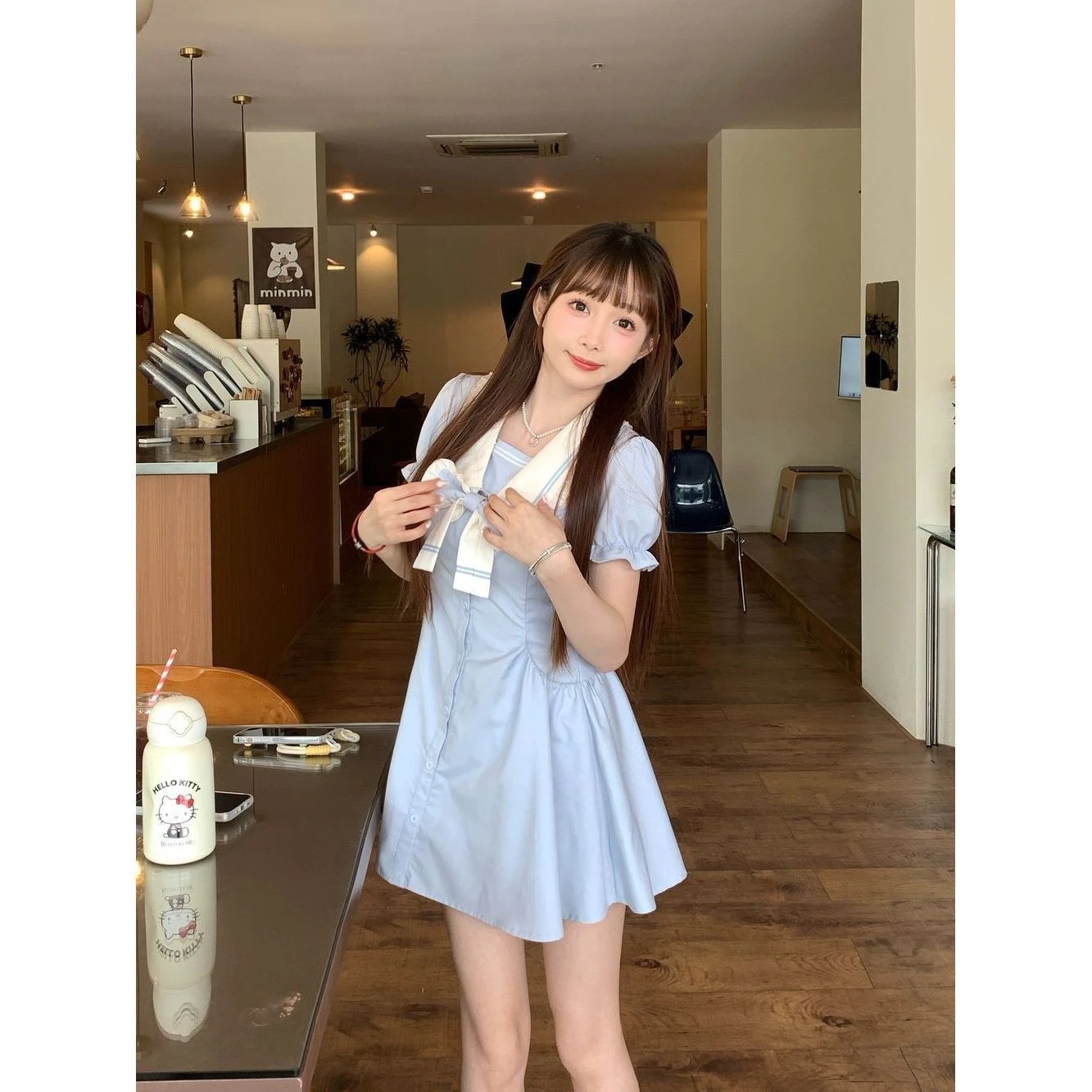青い学院風泡袖ワンピース女性夏の小柄な青いお姫様スカート森系フレッシュスカート潮