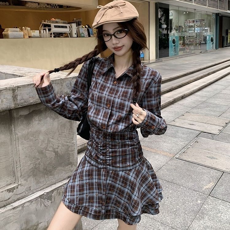 蝶結びの格子縞のpolo襟の長袖のワンピースの女性の春の新型の甘辛い風は腰を収めてやせているスカートのケーキのスカートを現します