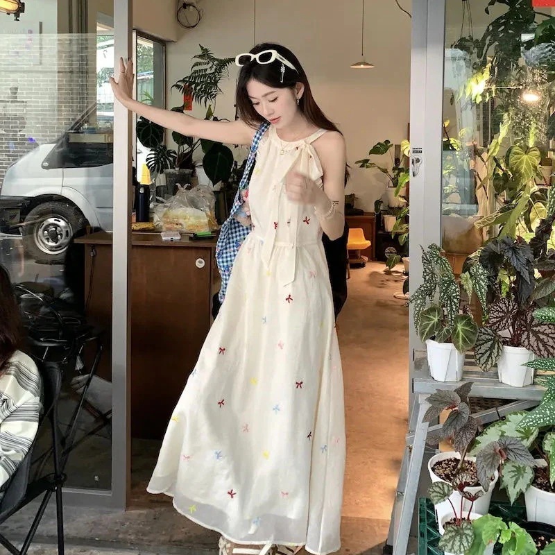 甘い末の蝶結びの高級なストラップの首のワンピースの女性の夏は腰を収めてやせているa字のスカートの小さい衆の長いスカートを現します
