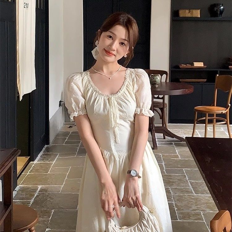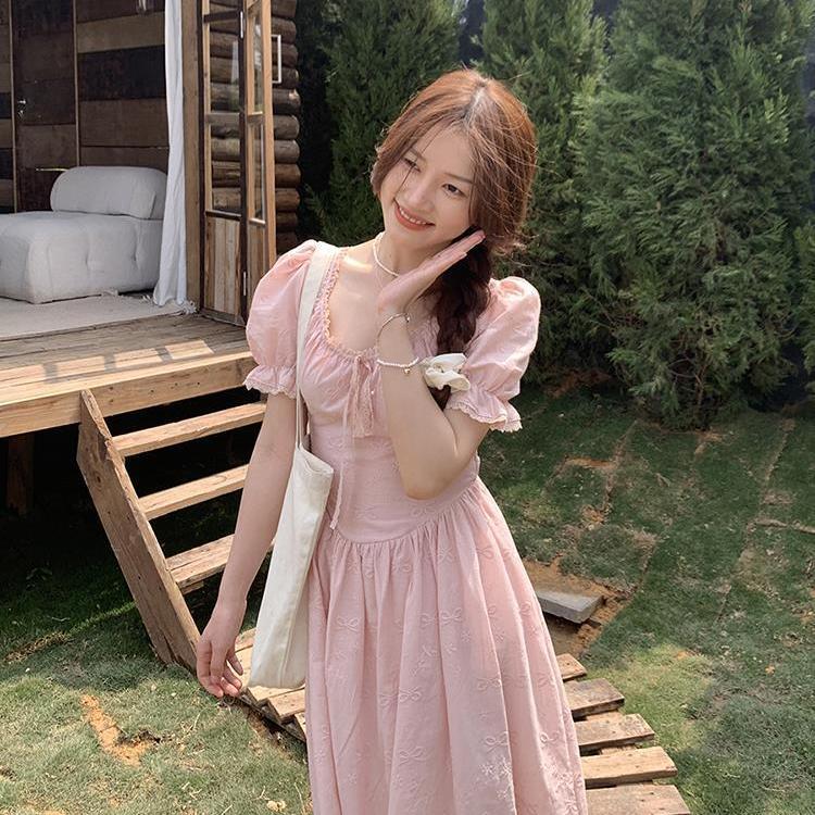 ワンピースの女性の夏の新型の韓系は腰を収めてやせているレースを現して優しい休暇のフランス式A字の長いスカートをつなぎ合わせます