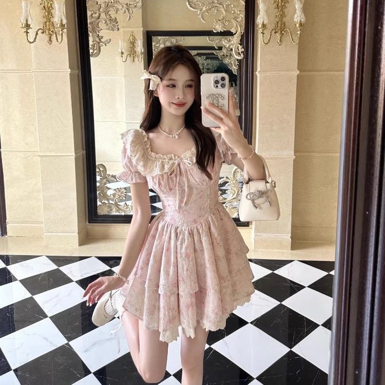 レトロな純粋な欲望の泡の袖のワンピースの女性の夏の新型の小さい人は甘くて腰を収めてやせている花のスカートのスカートを現します
