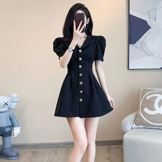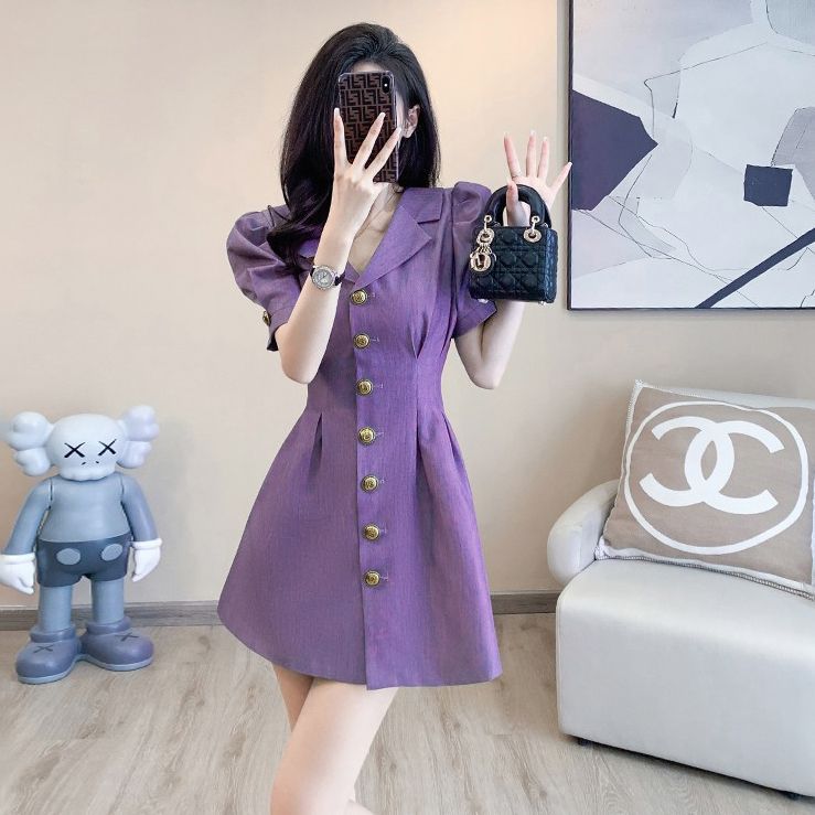 ヨーロッパのスーツの襟は腰のワンピースの女性の夏の新型のハイウエストはやせているファッションの気質の半袖a字のスカートを現します