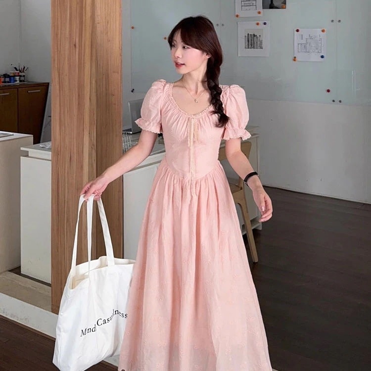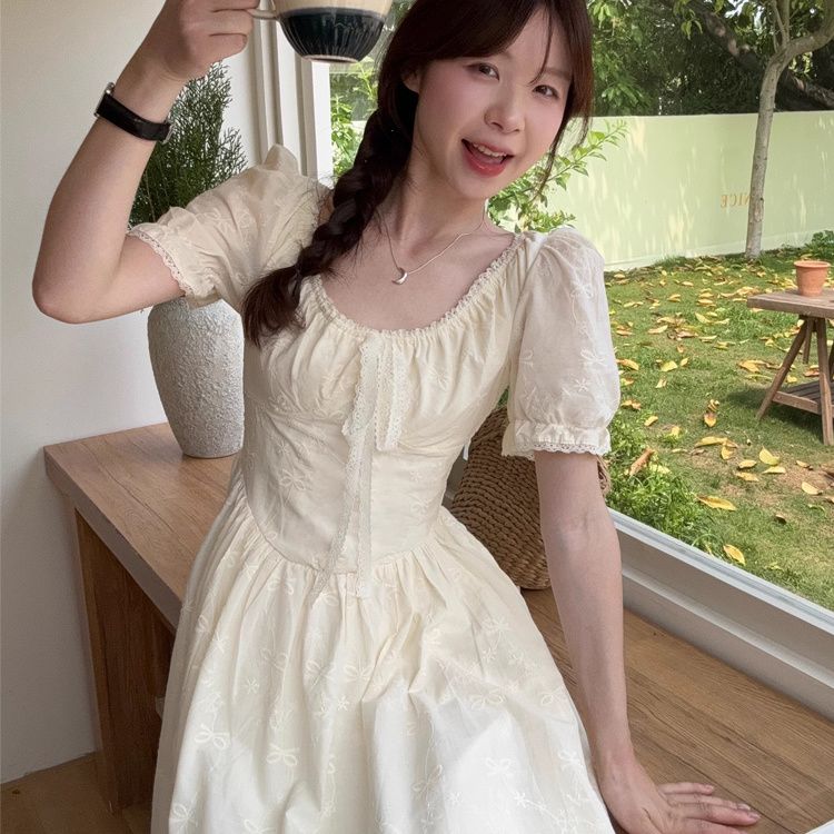 優しい風の甘い泡の袖のレースのジャカードの刺繍のワンピースの夏の新型は腰を収めてやせている長いスカートの女性を現します