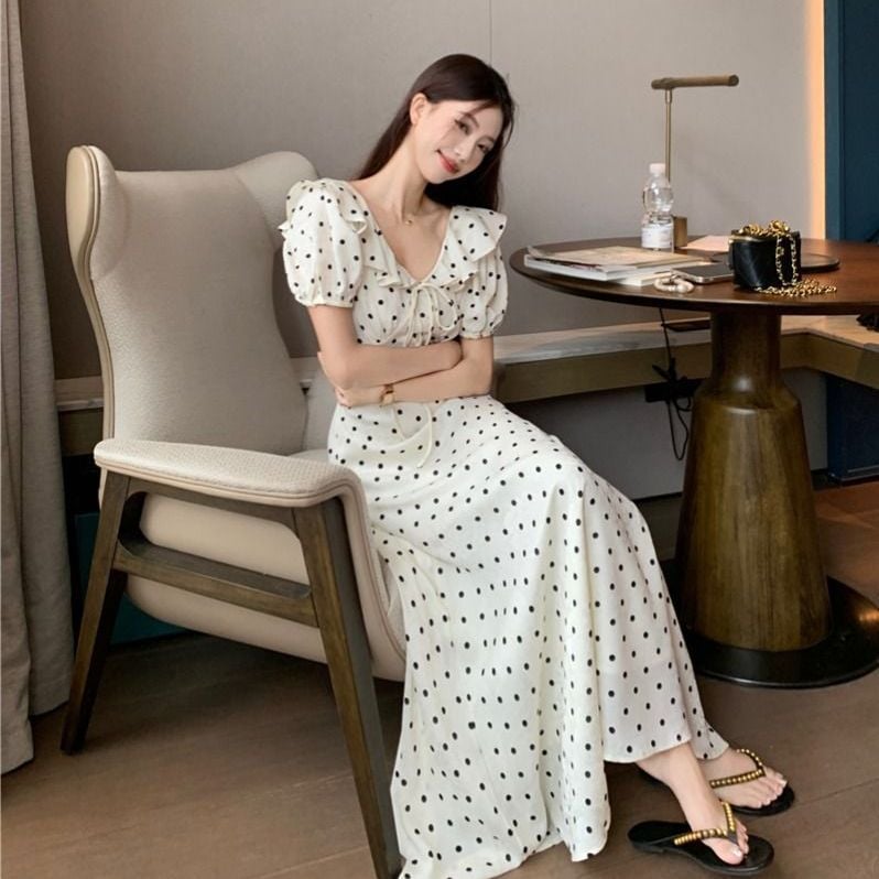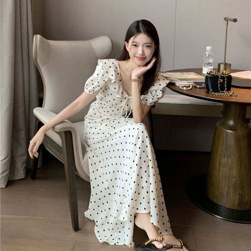フランスの優しい初恋のスカートのレトロな波の点のワンピースの女性の夏は腰を収めてやせています