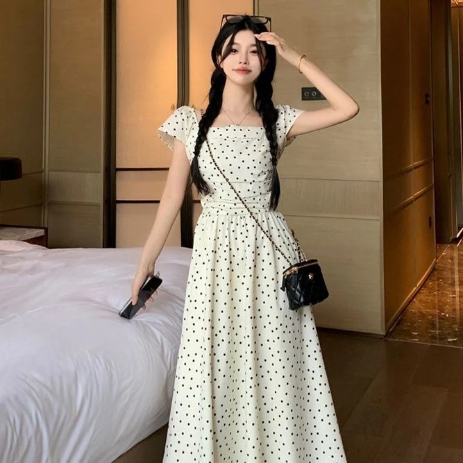 フランス式の襟の波点の小さい飛袖のワンピースの女性の夏は腰のa字のスカートの気質の優しい風の休暇の長いスカートを収めます