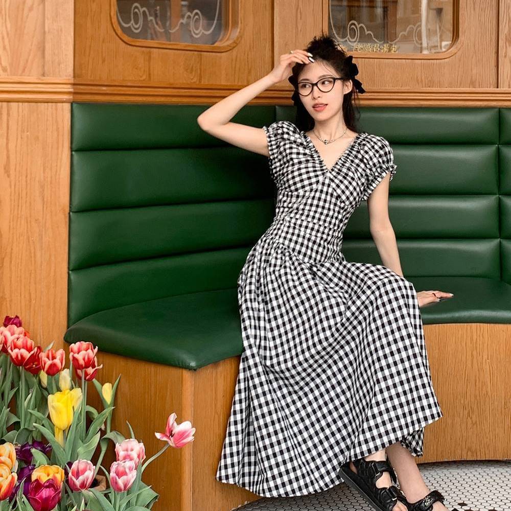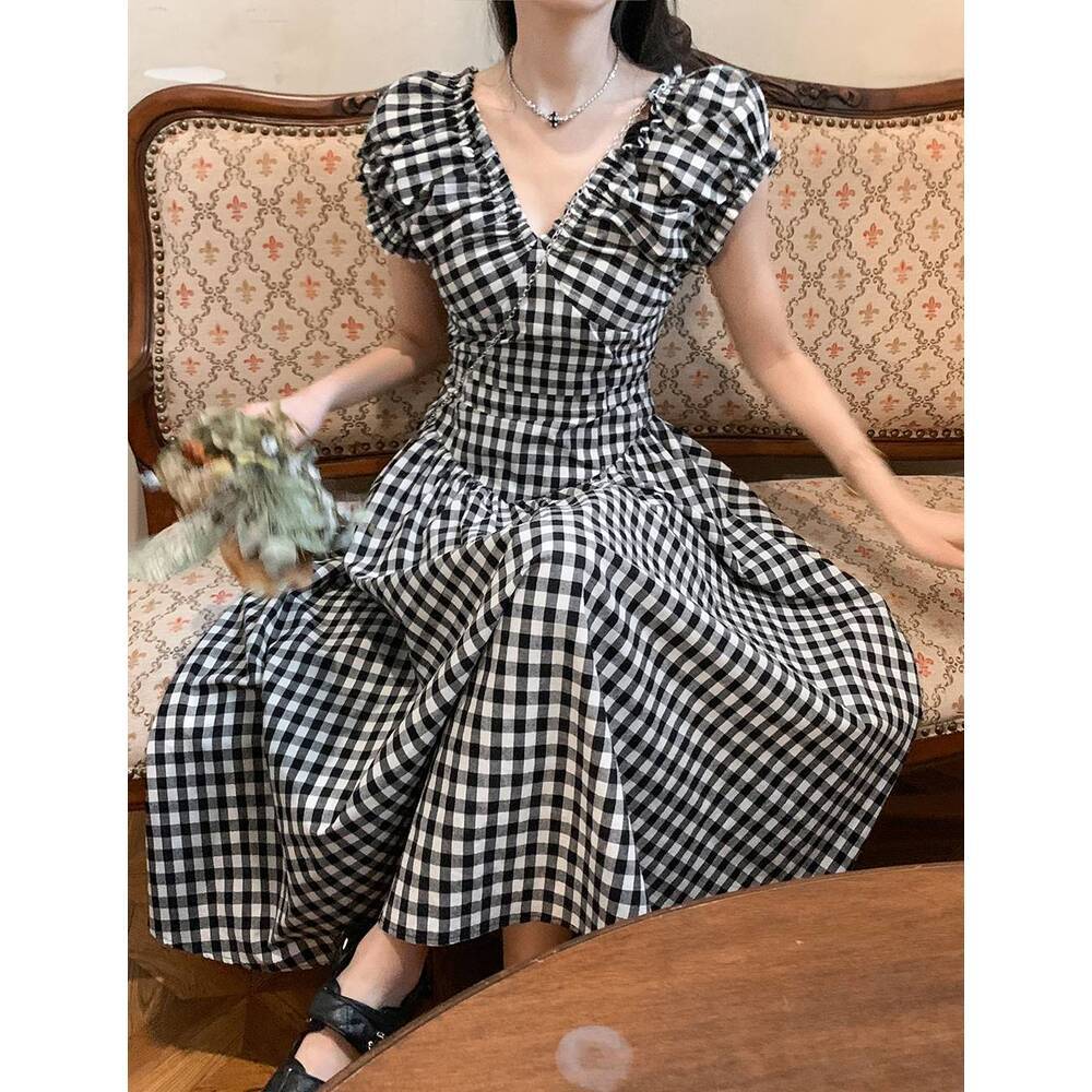 白黒の格子のvネックのワンピースの女性の夏の新型のフランスの復古のデザイン感の小さい背は腰の気質の長いスカートを収めます