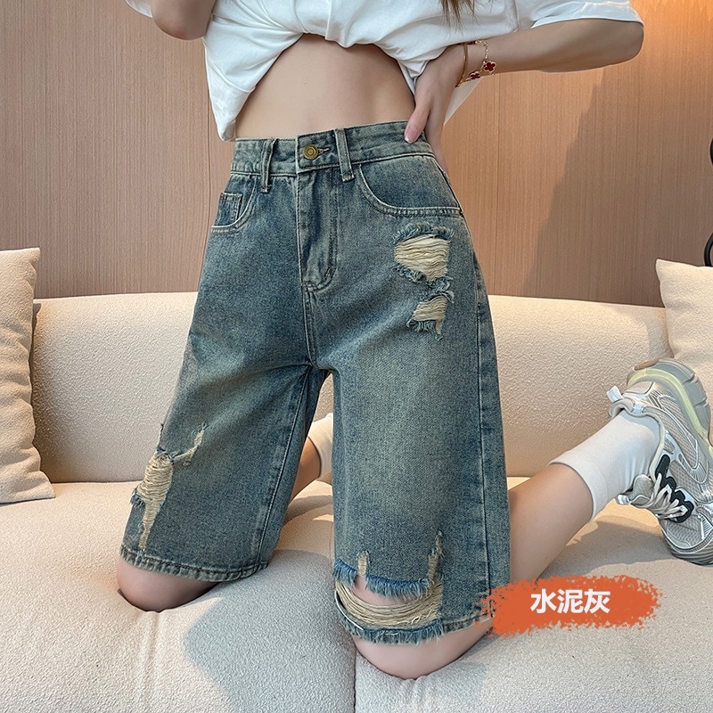 レディース5分丈デニムショートパンツ 2026年夏の新作 ハイウエストでスリムに見えるAライン5分丈 ダメージ加工ストレートシルエットのショートパンツ・ハーフパンツ