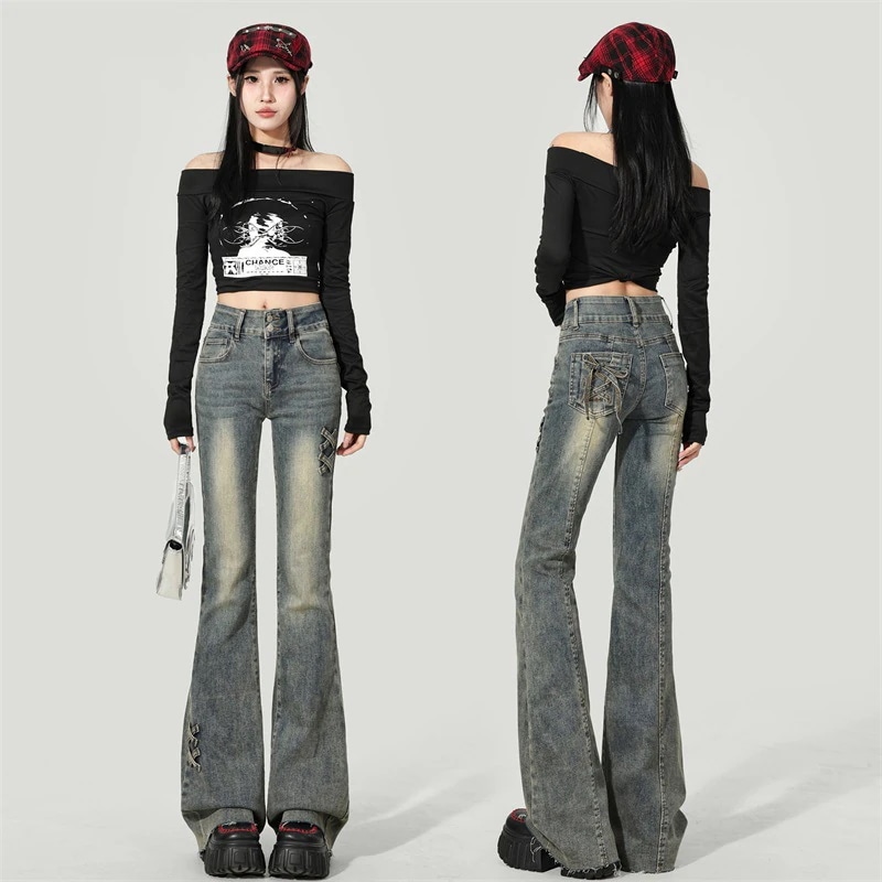 レトロ風ハイウエスト・微フレアデニムパンツ(レディース)2025年夏 薄手・新作・スリムフィット・小柄向け・大人気・ホースライダースタイルのロングパンツ