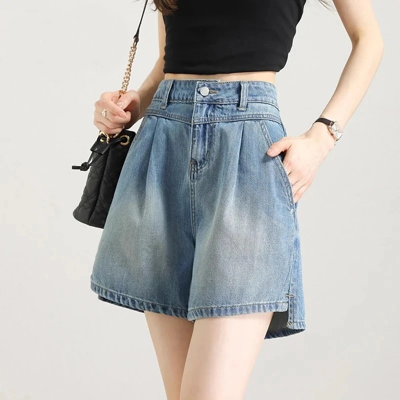 2025年夏新作 スリムシルエットのスリット入りレディースデニムショートパンツ ハイウエストAライン ゆったりシルエット 小柄な方になアシンメトリー丈の5分丈ショートパンツ・ハーフパンツ