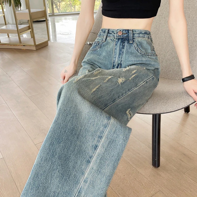 ライトカラーのダメージ加工ワイドデニムパンツ(女性用・ハイウエスト) 2025年春夏新作 ゆったりとしたシルエットでスリムに見えるストレート丈のロングパンツ