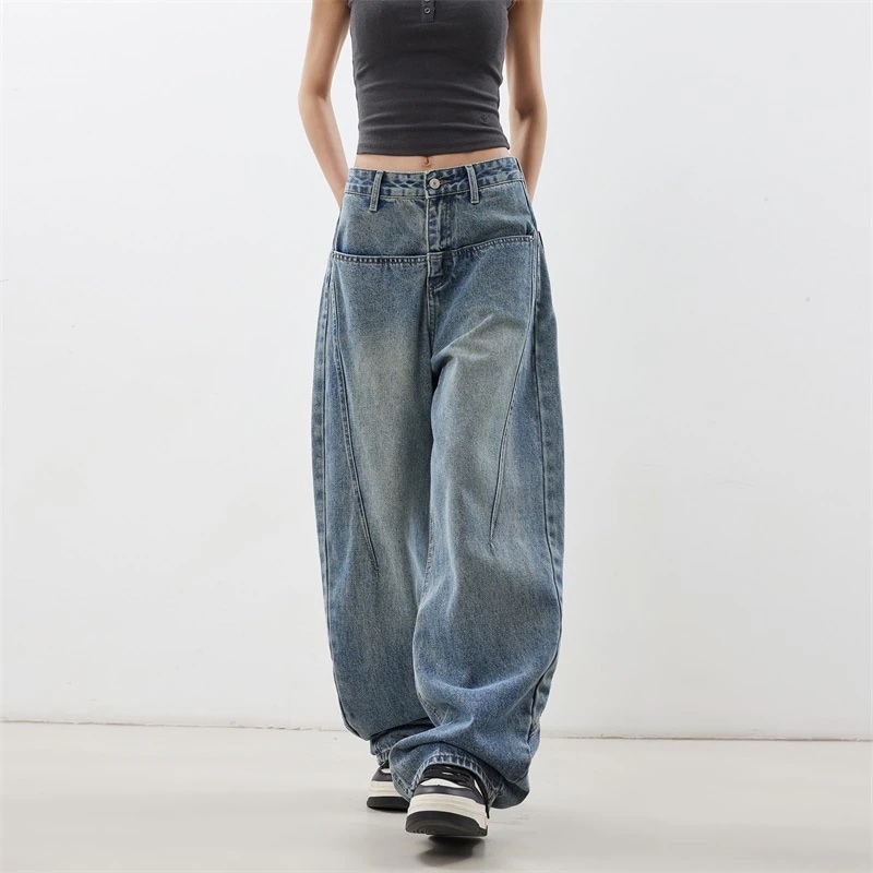 アメリカンスタイルのブルー・カーブド・デニム レディース 2025年秋冬 ルーズフィットワイドパンツ デザイン性のハイウエストワイドパンツ 新作ロングパンツ