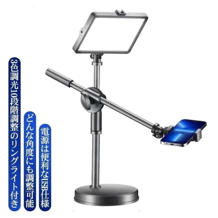 スマホスタンド 俯瞰撮影 LED リングライト 伸縮可能 自撮りライト ライブ配信 YouTube 卓上 影なし iPhone 明るさ 角度 高さ調節可能 タブレット Tiktok ライブ ネット授業
