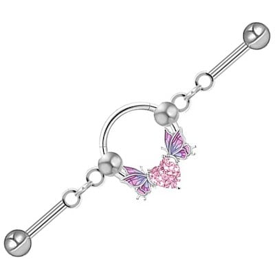 ボディピアス ピンクジュエルハートバタフライリングダブルジョイント ストレートバーベル ステンレス ゲージ16G インダストリアル 曲がる 動く 耳軟骨 つなぐ 蝶チョウ bb830xxxxxxxx
