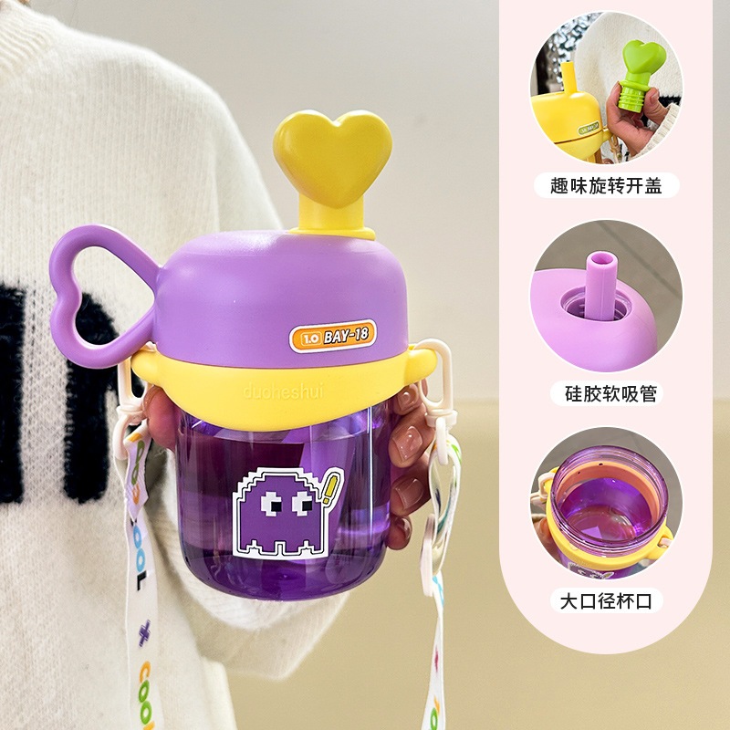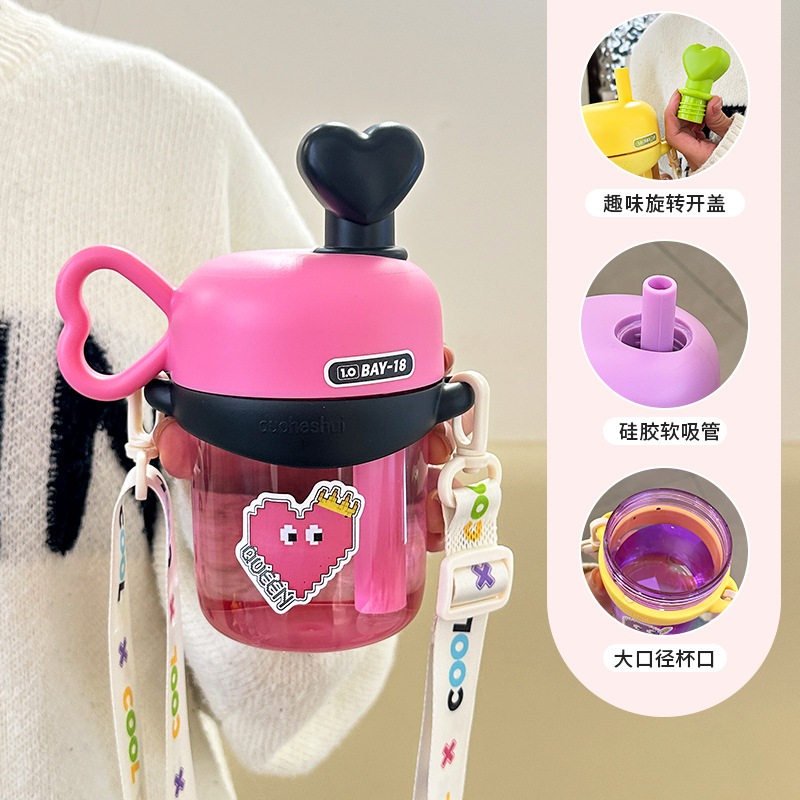 ハート型 カップル用ボトル 女性用 可愛い 独創的 ストロー付き ショルダーストラップ付き 持ち運び便利 水漏れ防止 おしゃれ 学生用