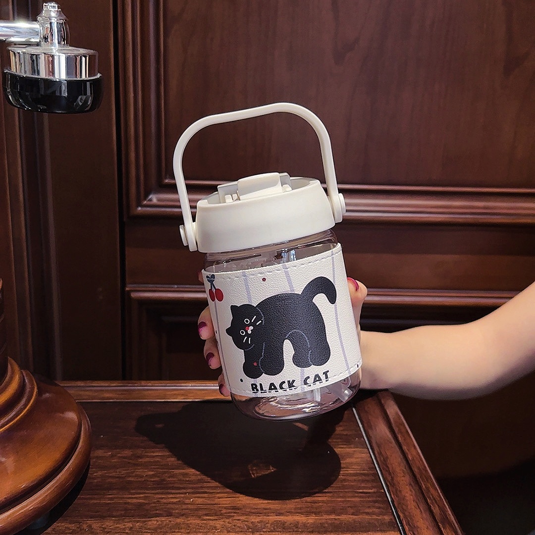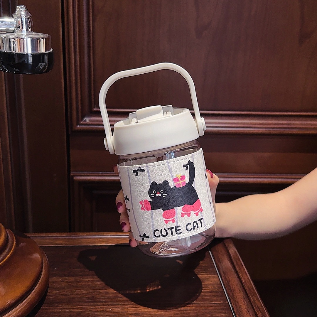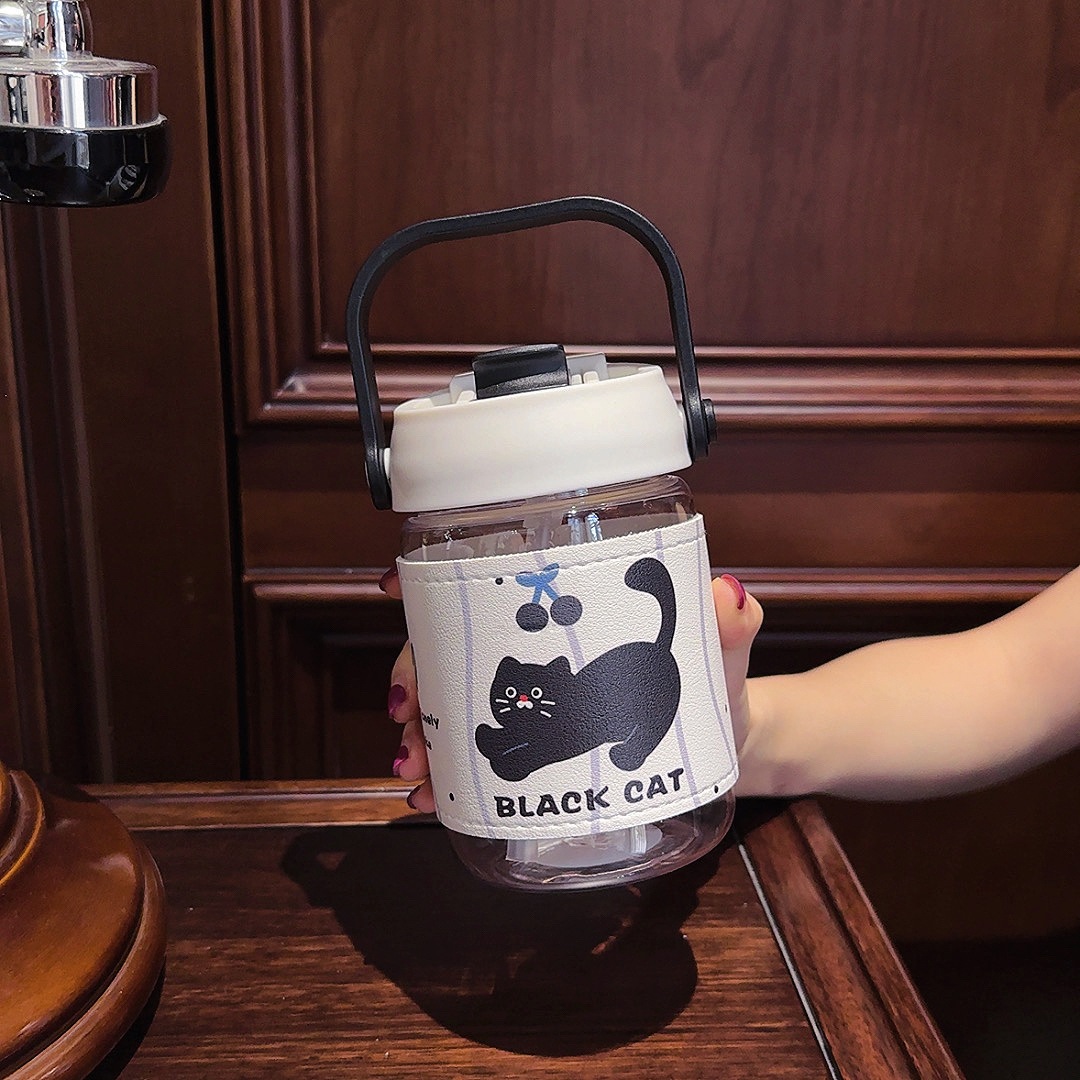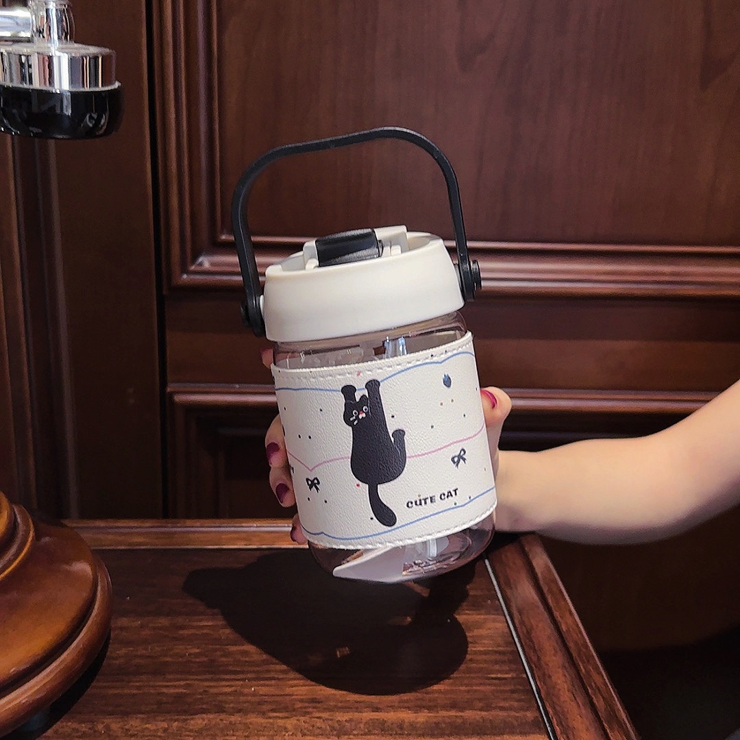 カートゥーン柄 レザーケース付き ストロー付きボトル 2WAY飲み口 熱防止 持ち運び便利 コーヒー用 学生・カップル用 可愛い 女性用