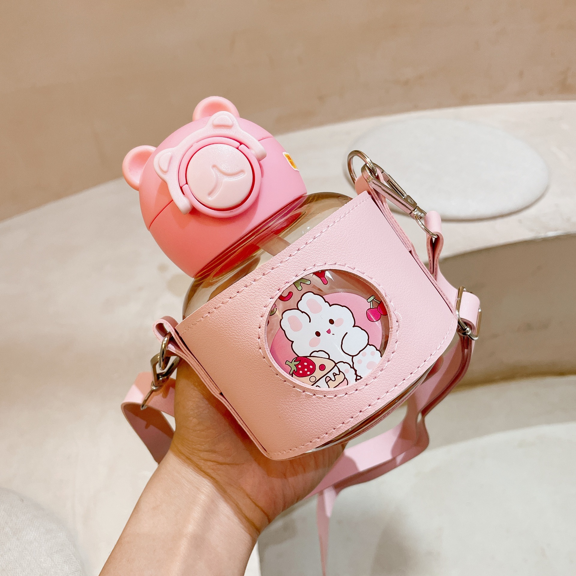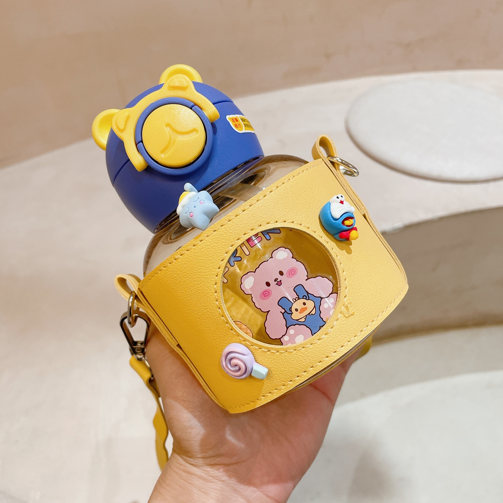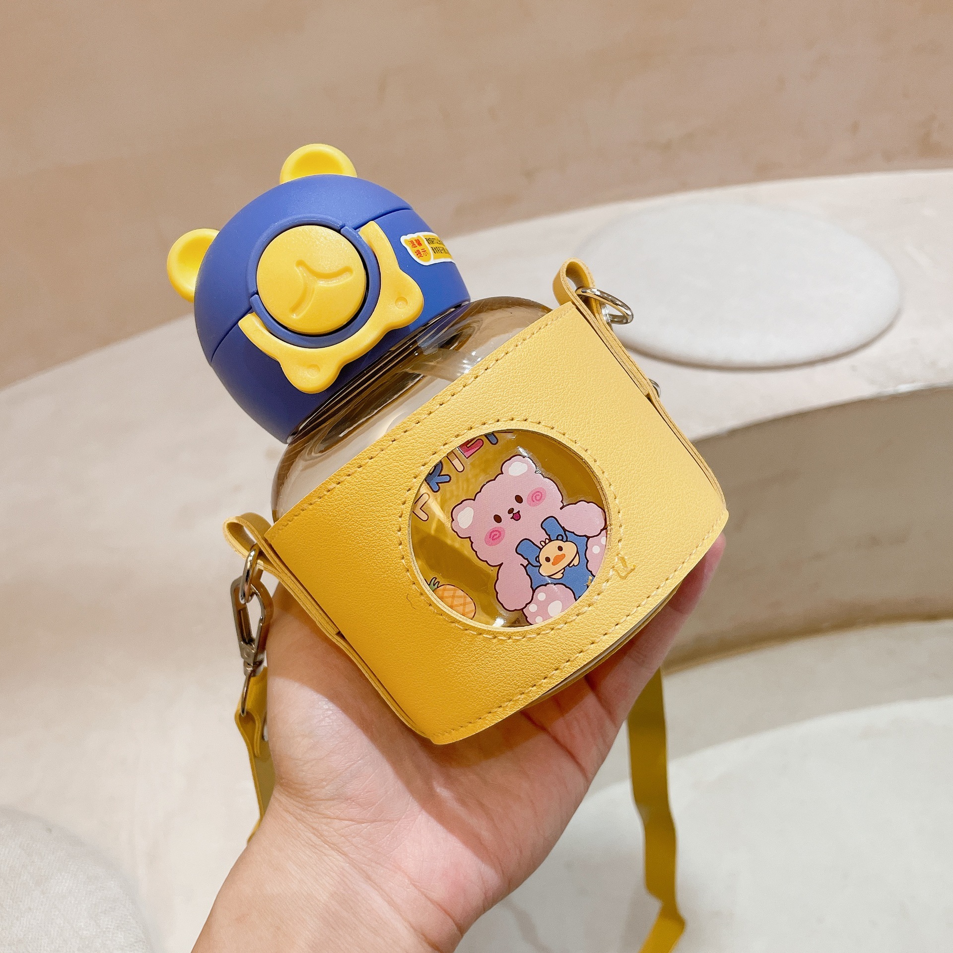 レザーケース付き 大容量ボトル ストロー付き 持ち運び便利 耐衝撃性 子供用 ストロー付きボトル 蓋付き プラスチック製 赤ちゃん用