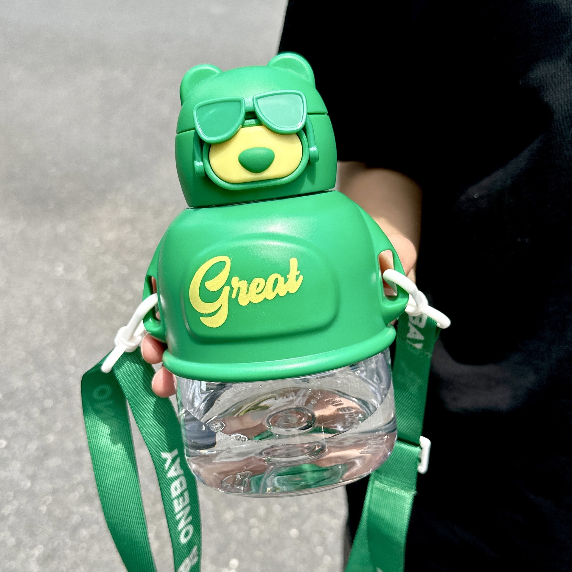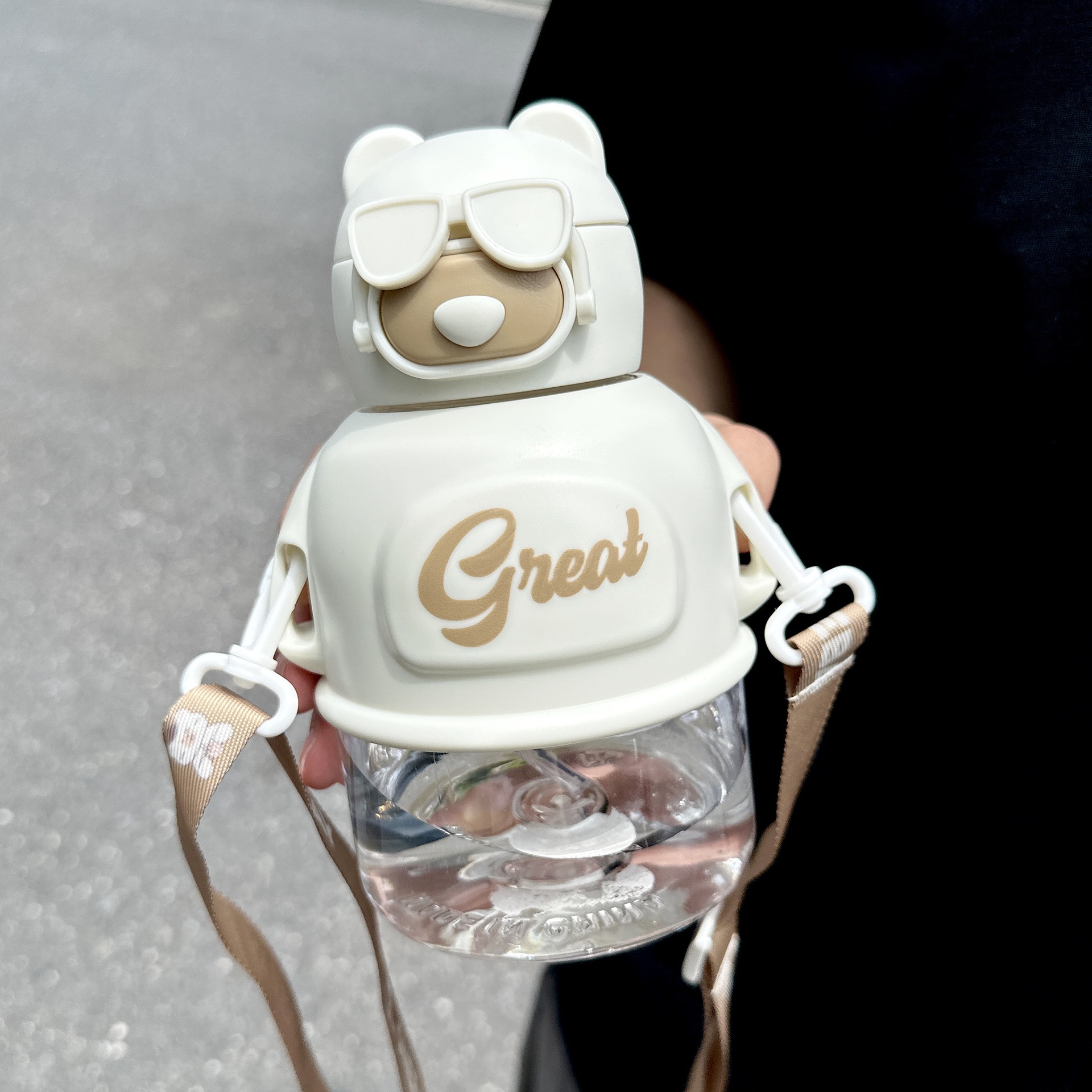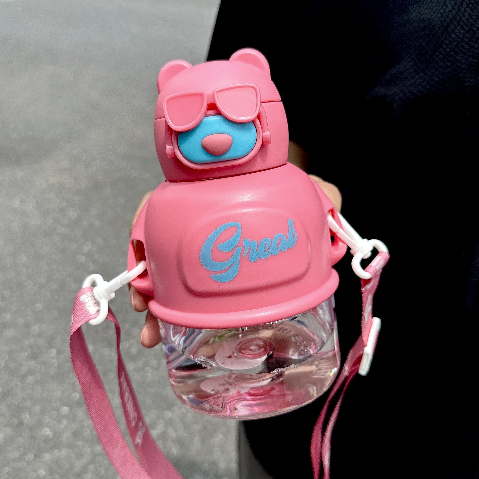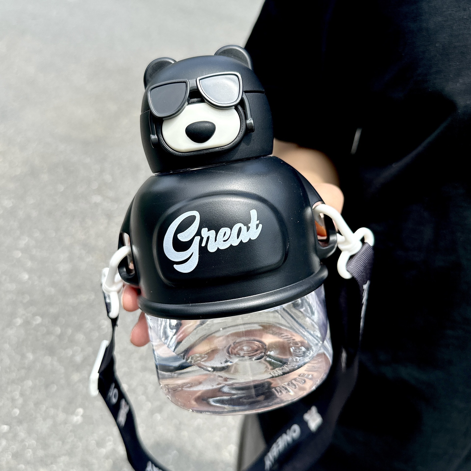 メガネクマ柄 おしゃれ プラスチック製ボトル 可愛い 子供用 ストロー付き 大容量 学生用 持ち運び便利