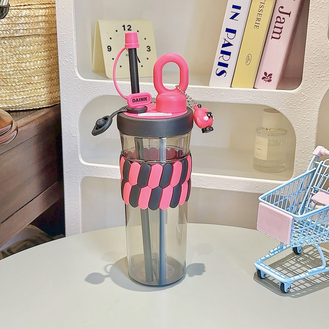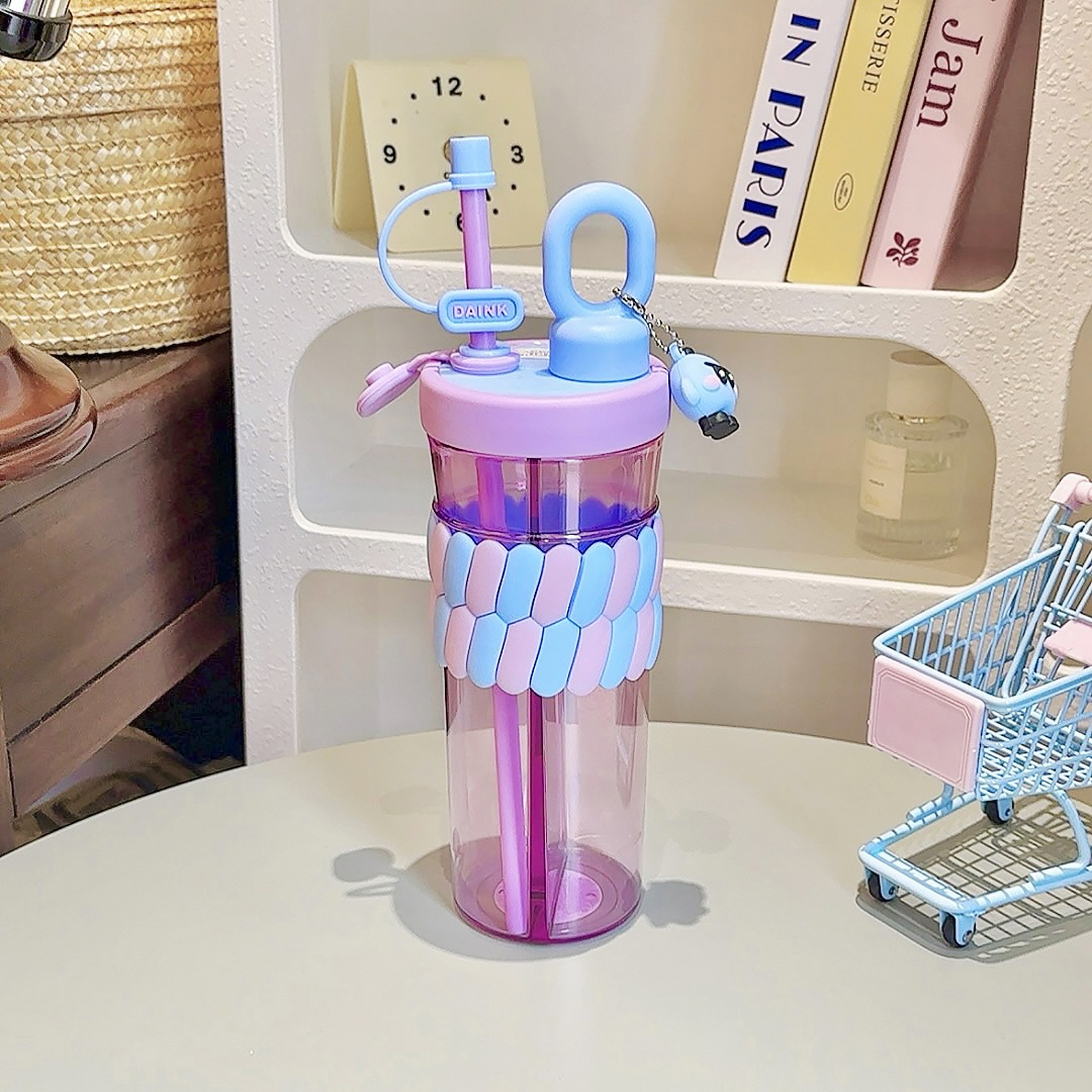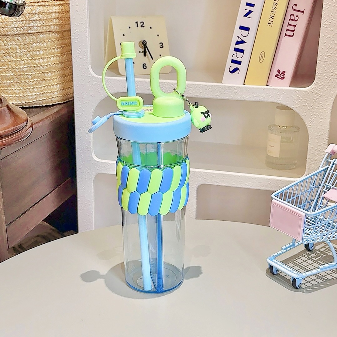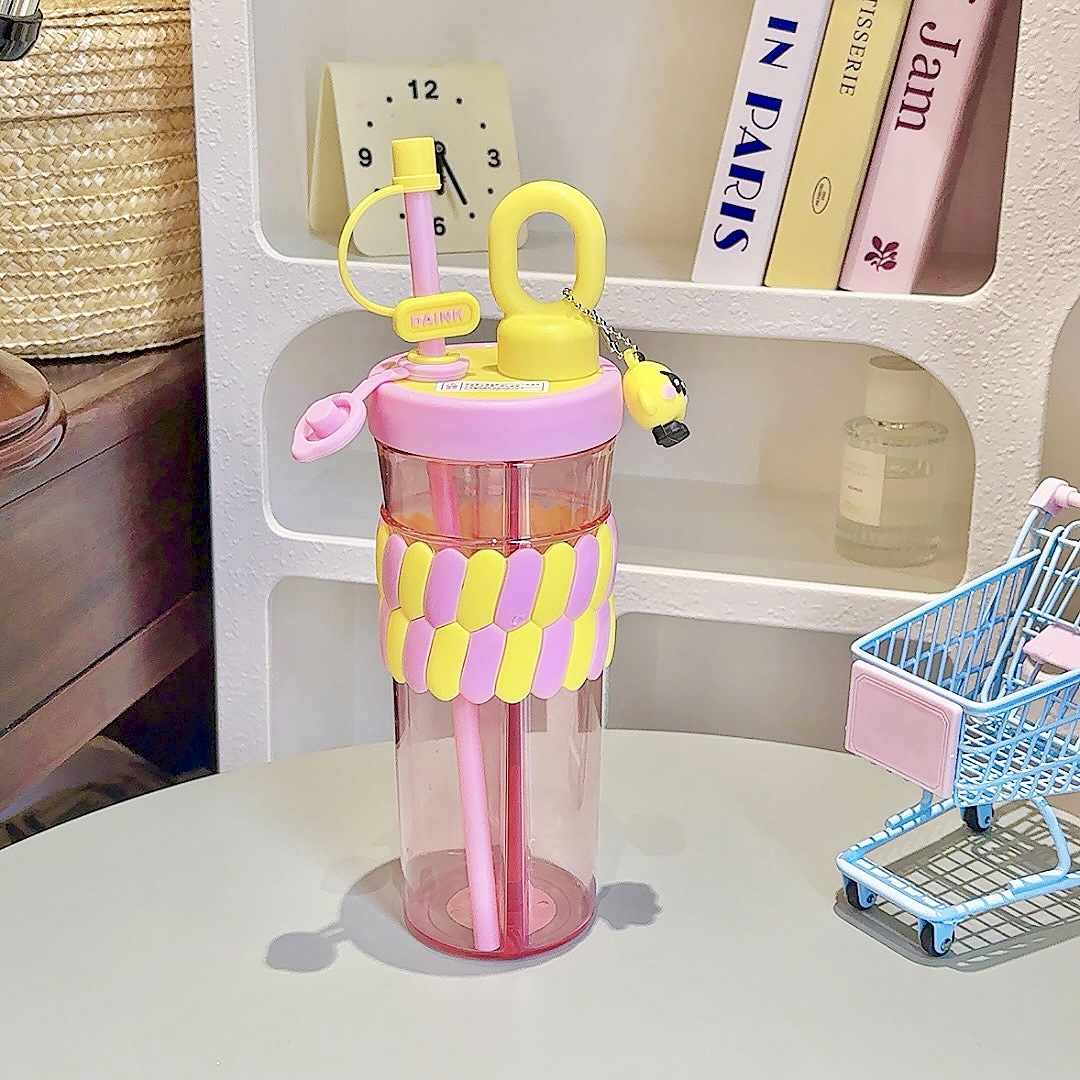 2WAY飲み口 2層構造ボトル カートゥーン柄 学生用 可愛い プラスチック製 独創的 女性用 ストロー付き