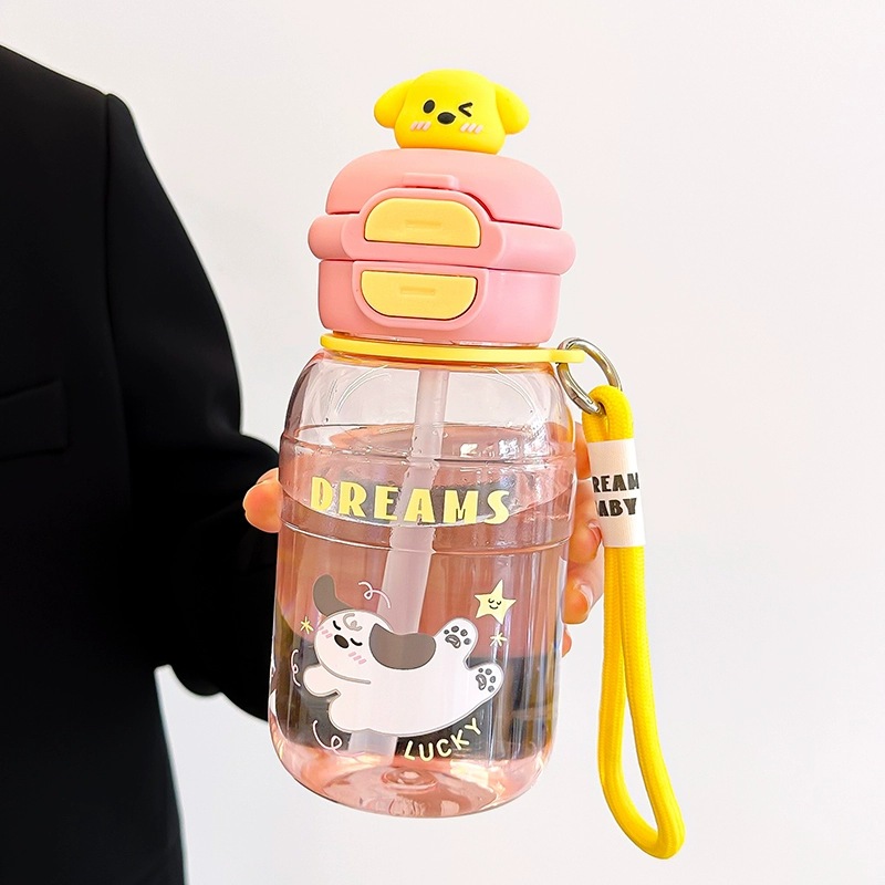 カートゥーン柄 フィギュア付き プラスチック製ボトル 独創的 1蓋2WAY飲み口 ストロー付き アウトドア用 持ち運び便利 持ち手付き 通学用