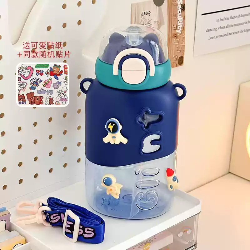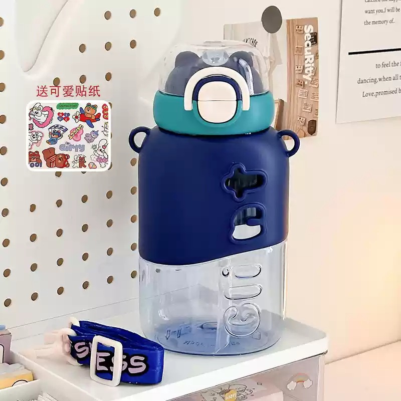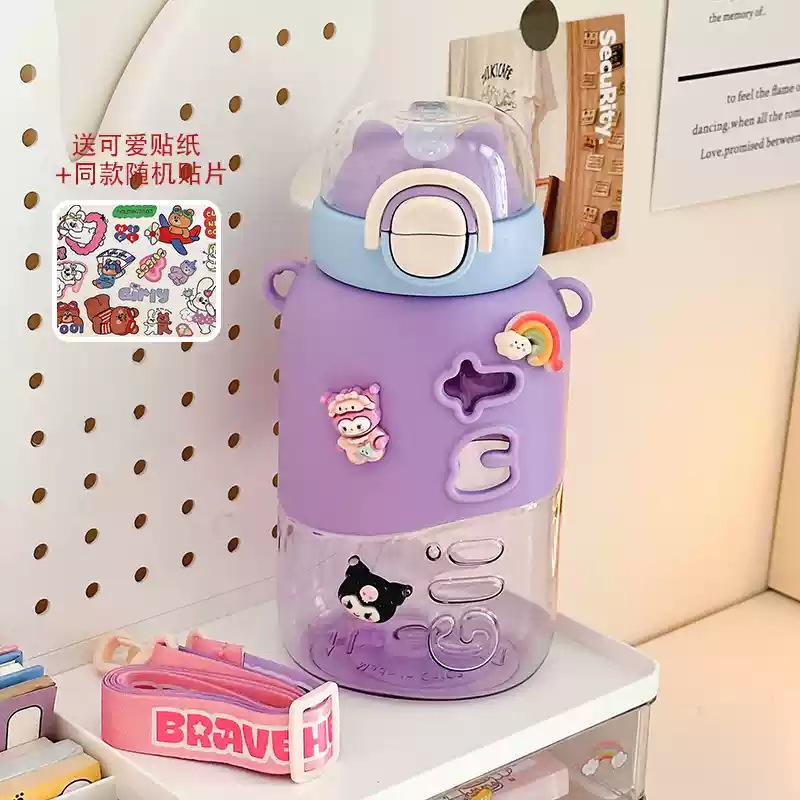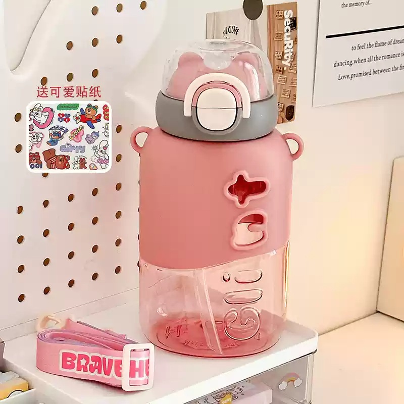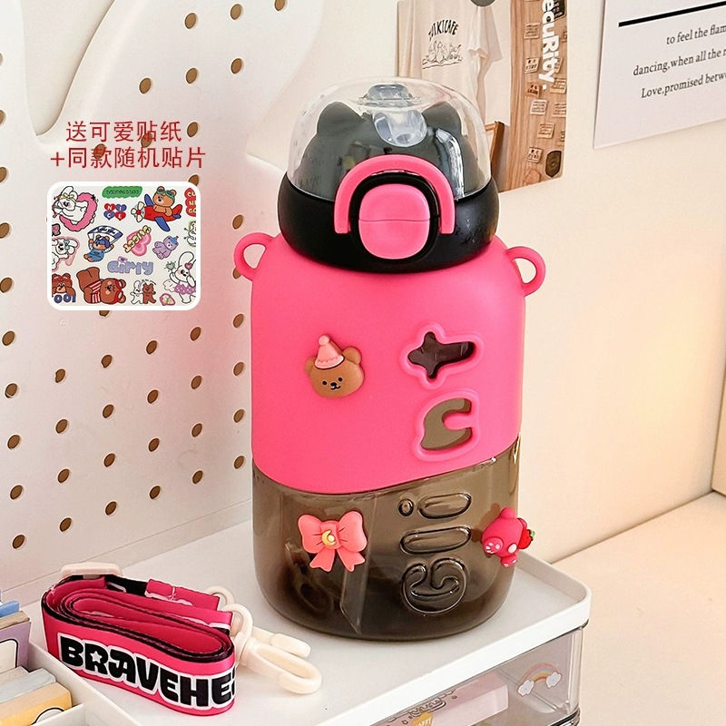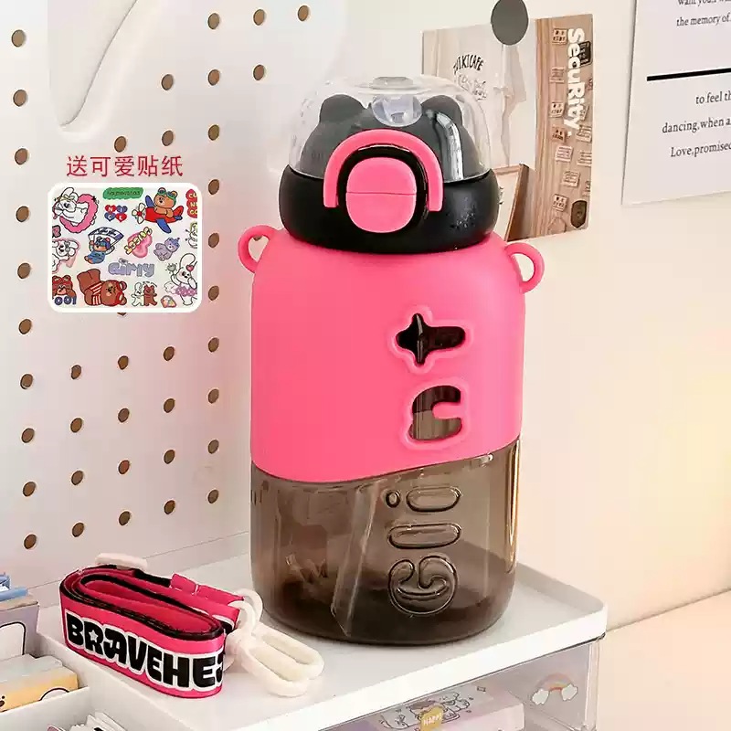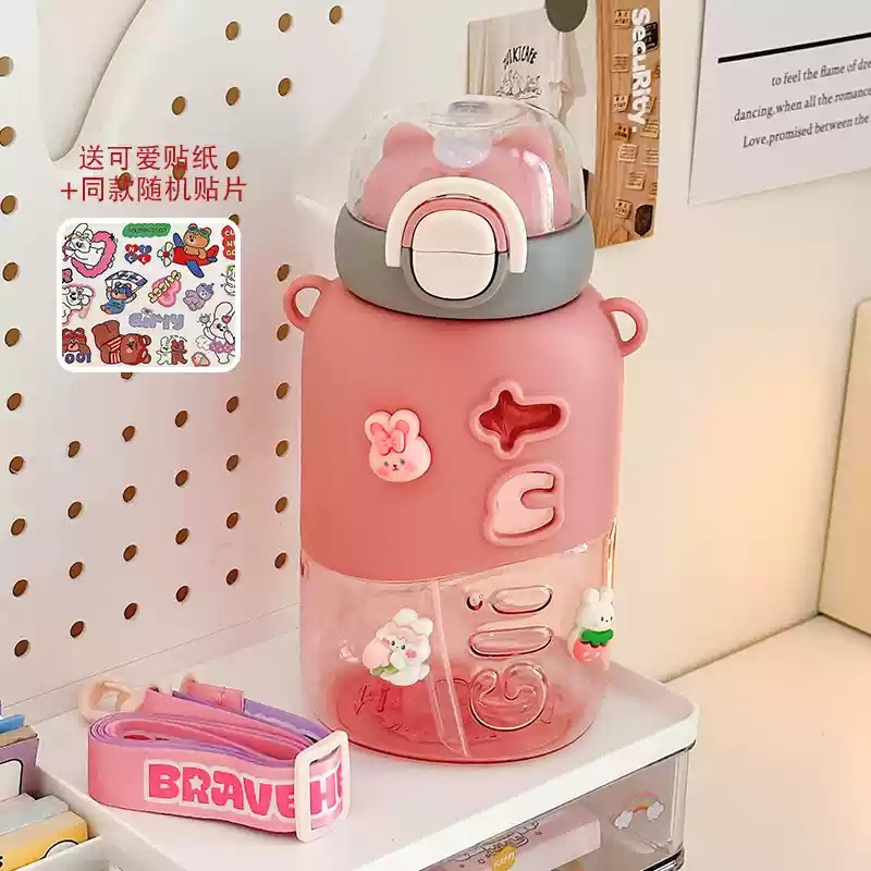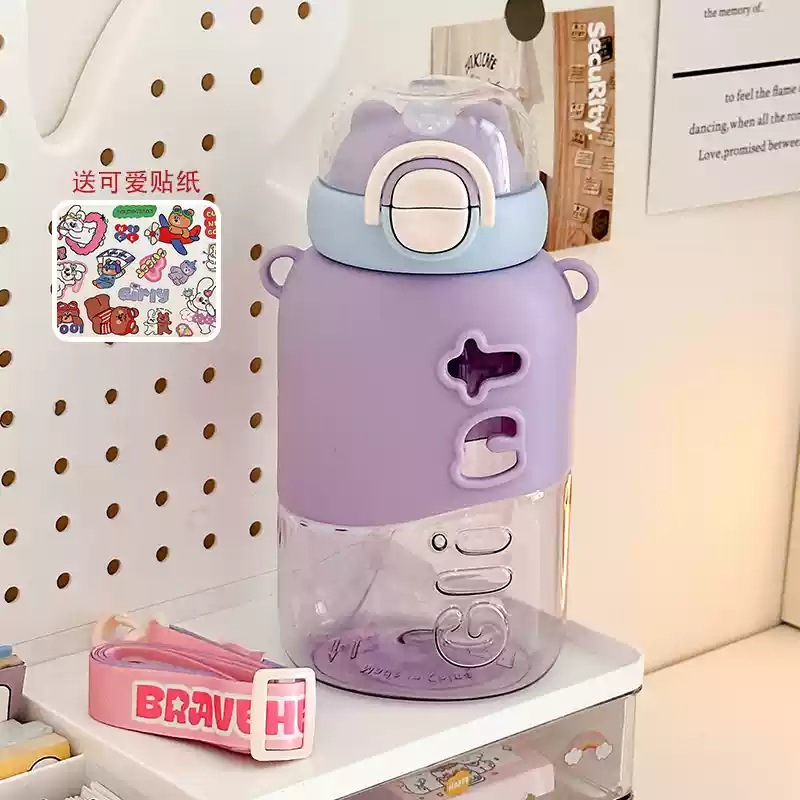 可愛い 女性用 プラスチック製ボトル 小茶日記 2WAY飲み口 ストロー付き 学生用 通学用 持ち運び便利 ショルダーストラップ付き