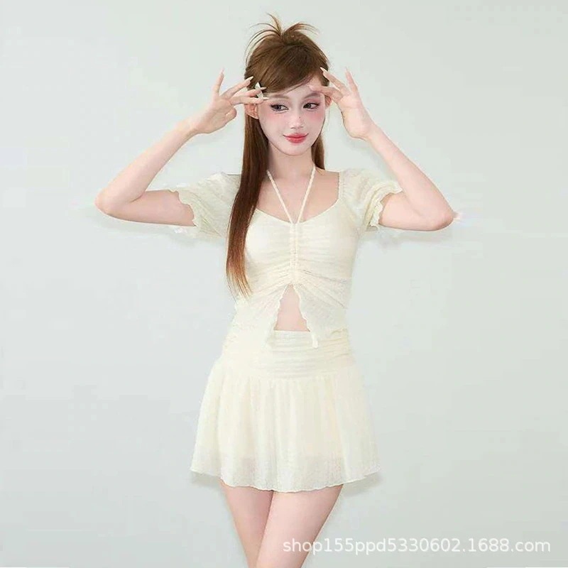 韓国ファッション 水着 レディース ツーピース セット 無地 高級 ポリエステル ティーン キュート 控えめ スリム効果 水着 水色系