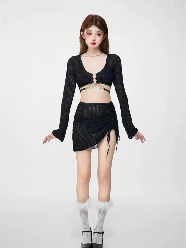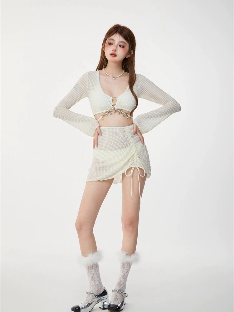 韓国ファッション ビキニ セット 長袖カバーアップ 包みスカート リボン リゾート 温泉 水着 レディース