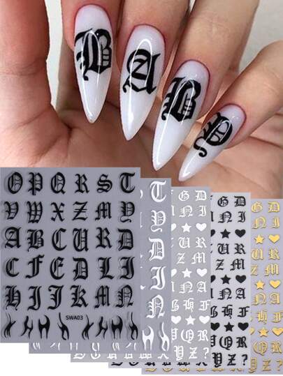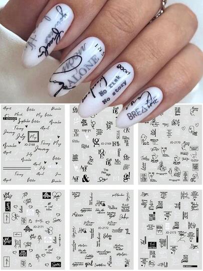 6枚 黒と白のアーティスティックレターネイルアートステッカー3Dゴシック英語の言葉文字ハート幾何学模様抽象的な顔のデザインDIY Y2Kスタイルの自己接着ネイルステッカーバレンタインデー