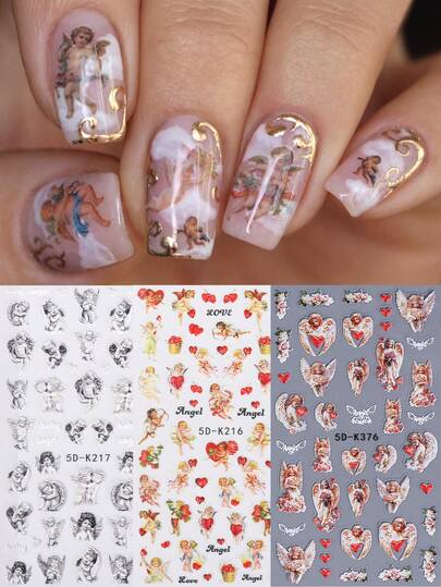 3個セット 型押し 5D 天使のハート ネイルアート ステッカー キューピッド 聖母マリア ローズ バレンタイン ネイルデカール レリーフ ネイルスライダー 自己接着 ホリデー ネイルデコレーション