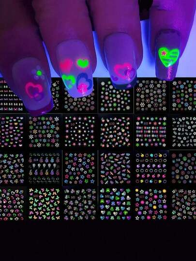 3D蓄光ネオンネイルシール 24枚入り輝くスパンコール 自己接着式ネイルアート ステッカー蝶 ハート フラワー ネイルデコレーション女性や女の子のDIYネイルアートに適しています