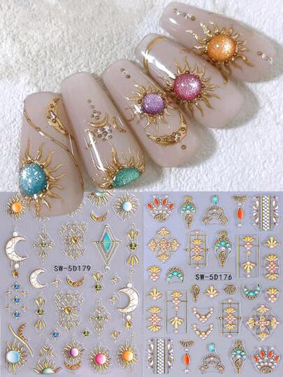 5Dメタルボヘミアン調エンボス ネイルステッカー 2枚セットレインボーゴールデンサン宝石レースエナメルネックレスムーンデザインDIYホログラフィック彫刻 自己接着ジェルネイルポリッシュス