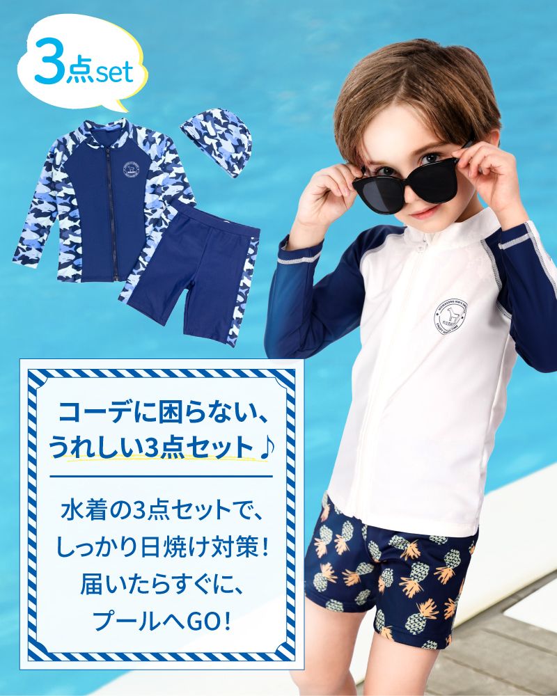 水着 男の子 子供 セパレート こども 小学生 子ども 着 やすい キャップ キャップ付き 長袖ラッシュガード ハーフパンツ 3点セット おしゃれ スイミング