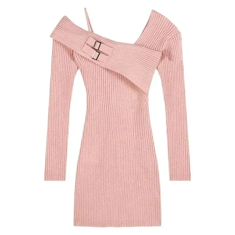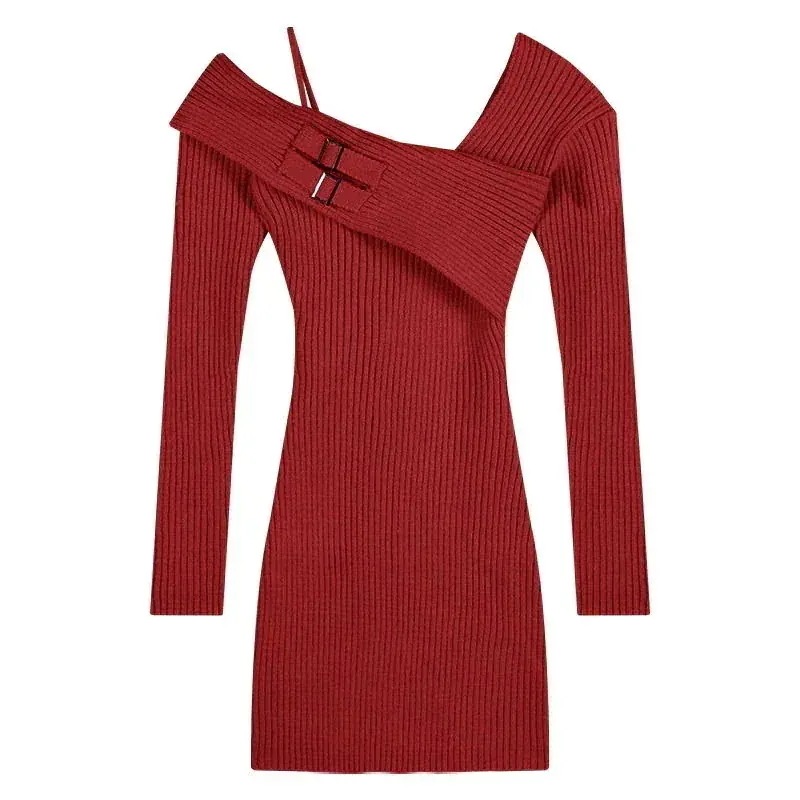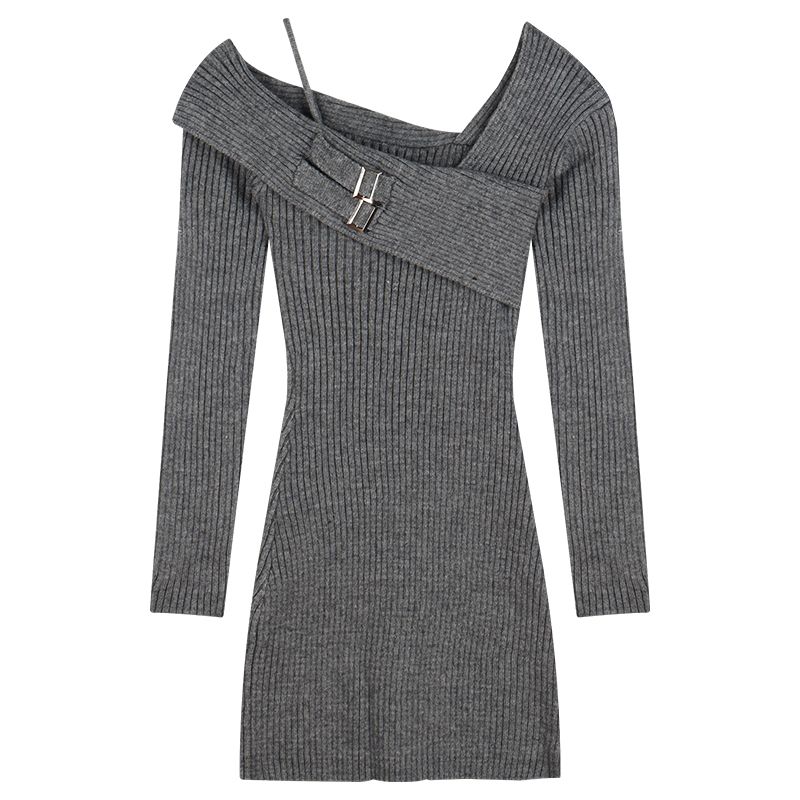 2024 秋冬 ニットニットワンピース長袖 セクシーオフショルダーネック無地セミロングセーター ベーシックニット