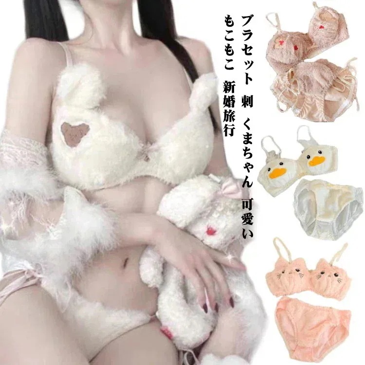 2月新タイプ入荷 ブラセット 刺繡 くまちゃんもこもこ セクシー系 ふわふわ 女の子 2 点セット ブラ ショーツ 防寒