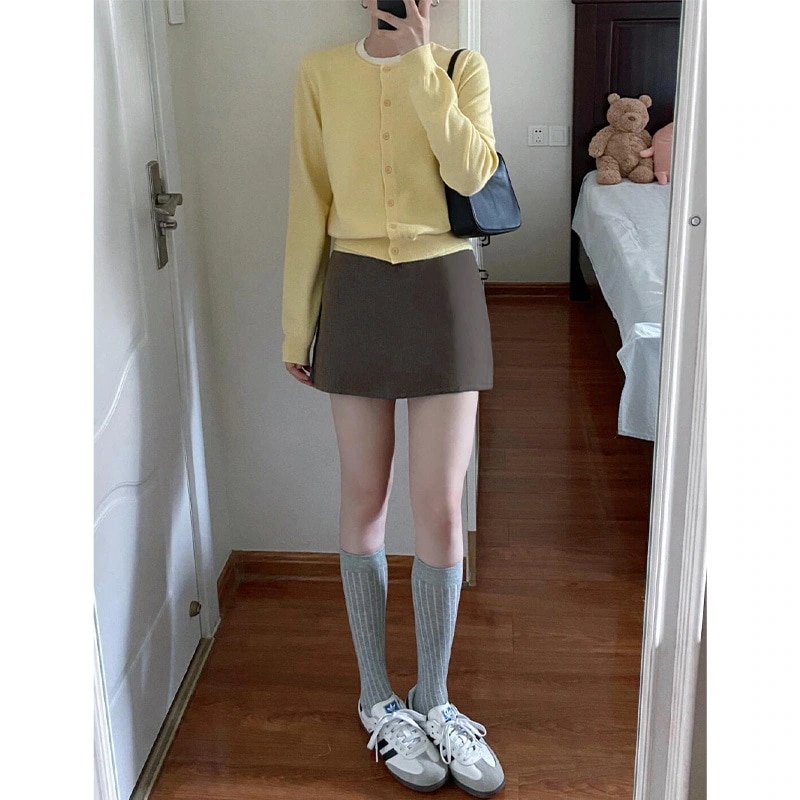 グレーのスーツヒップラインを強調するミニスカート(レディース春・夏用) ハイウエストでスリムに見えるAライン覗き防止スクール風スカート小柄な方にミニスカート