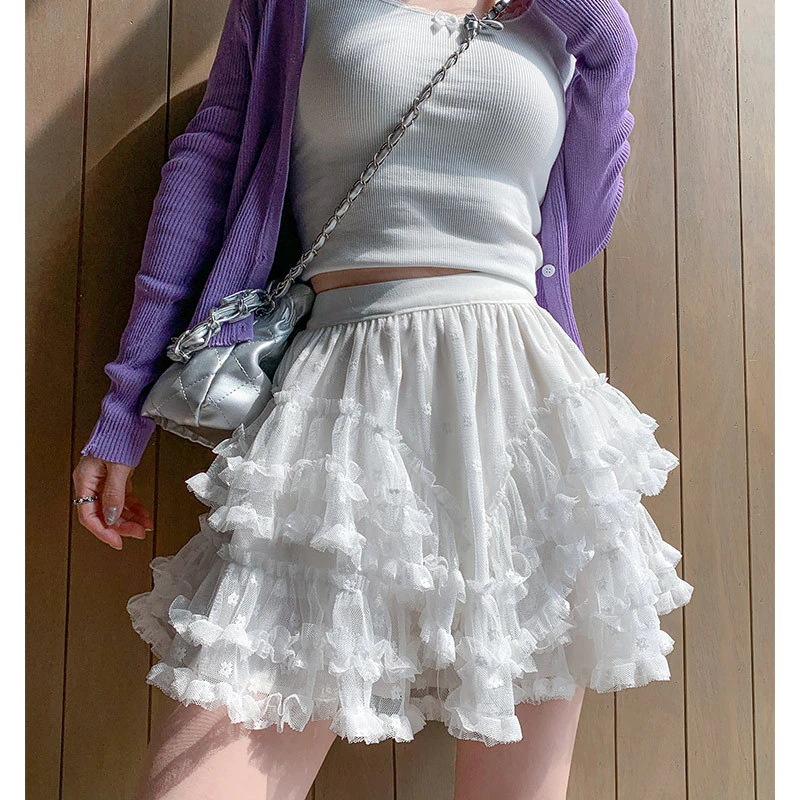 ホワイトレースのフリル付きケーキスカート レディース 夏の新作 プラスサイズ 裏地付き ハイウエスト スリム効果 低身長向け Aライン チュールスカート ミニスカート
