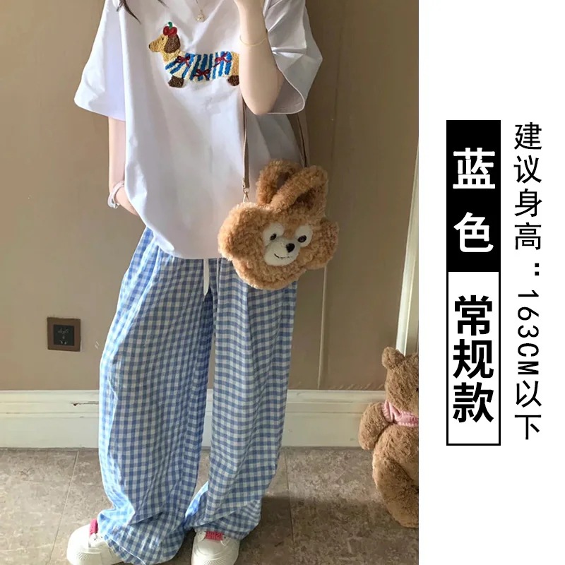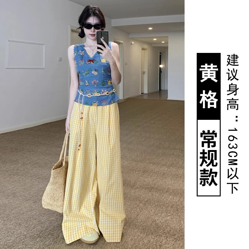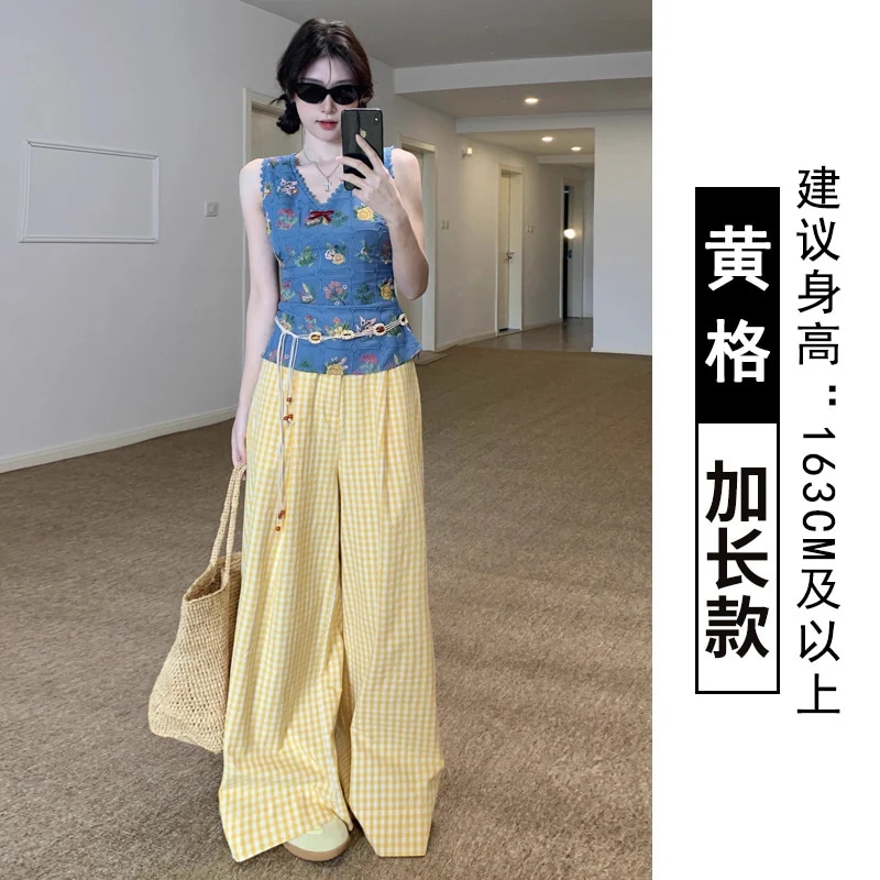 女性用 カラーブロックチェック柄ワイドパンツ(夏用) 2026年新作 ハイウエスト ルーズフィット カジュアル インスタ風 ハイウエスト ドレープ感 フロア丈パンツ