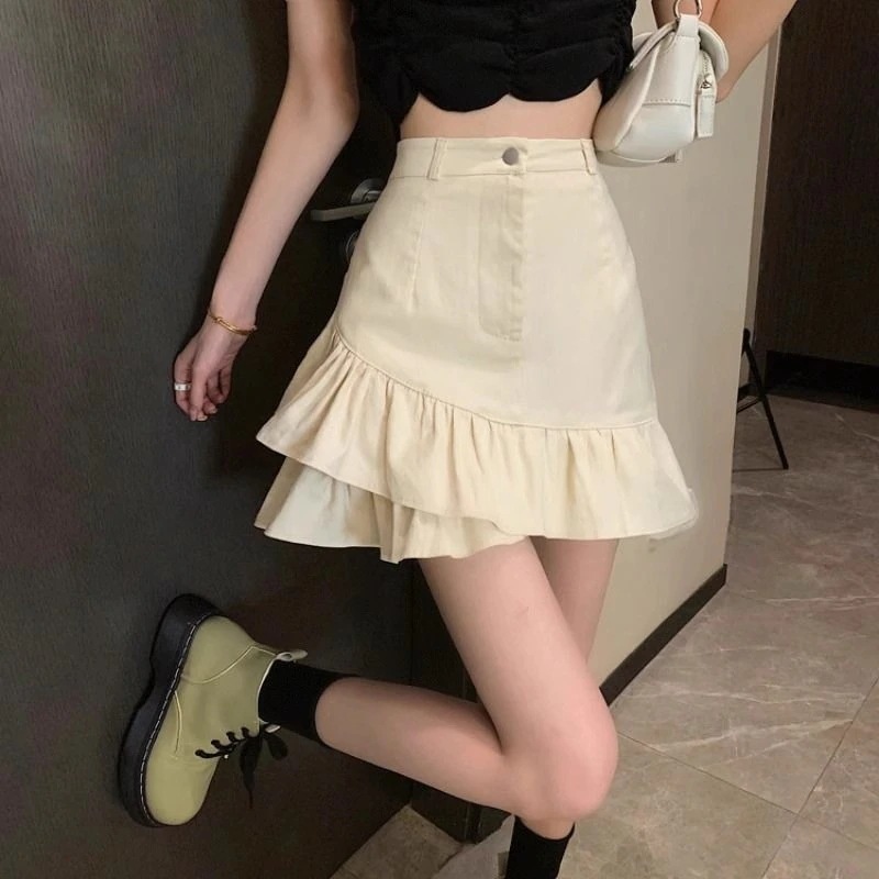 2025年春夏新作 スカート ホワイトデニム アシンメトリーフリル Aライン ハイウエスト ミニスカート(女性用・覗き防止)