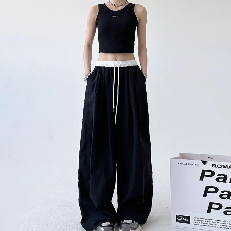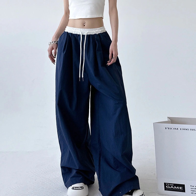 2026年春 アメリカン・レトロ カラーブロック カジュアルパンツ レディース ゆったりとした着心地 ハイウエスト ゆったりとしたドレープ感のフロア丈ワイドパンツ