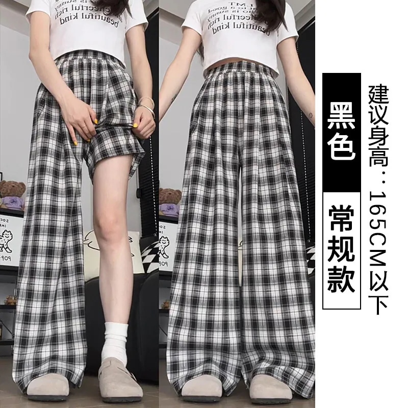 黒のチェック柄ワイドパンツ レディース 夏用 薄手 2026年新作 ハイウエストでスリムに見せる ドレープ感のあるゆったりストレートシルエットのカジュアルパンツ
